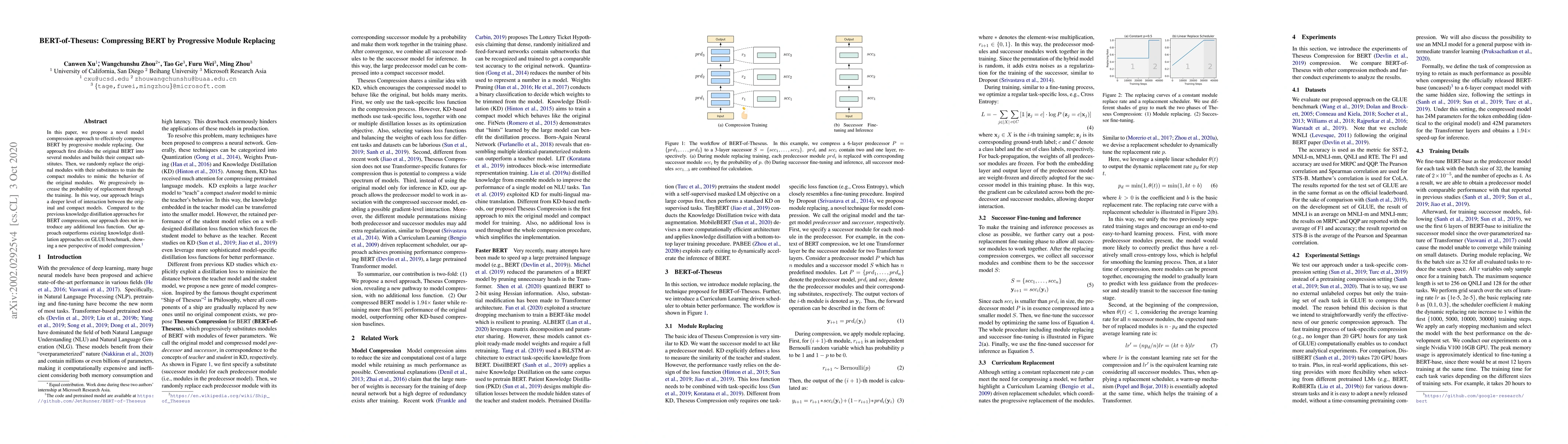 This paper introduces a novel BERT compression method using progressive module replacement, which divides BERT into modules and trains compact substitutes. The approach progressively replaces original modules with their substitutes, achieving better performance on GLUE benchmarks compared to knowledge distillation methods.