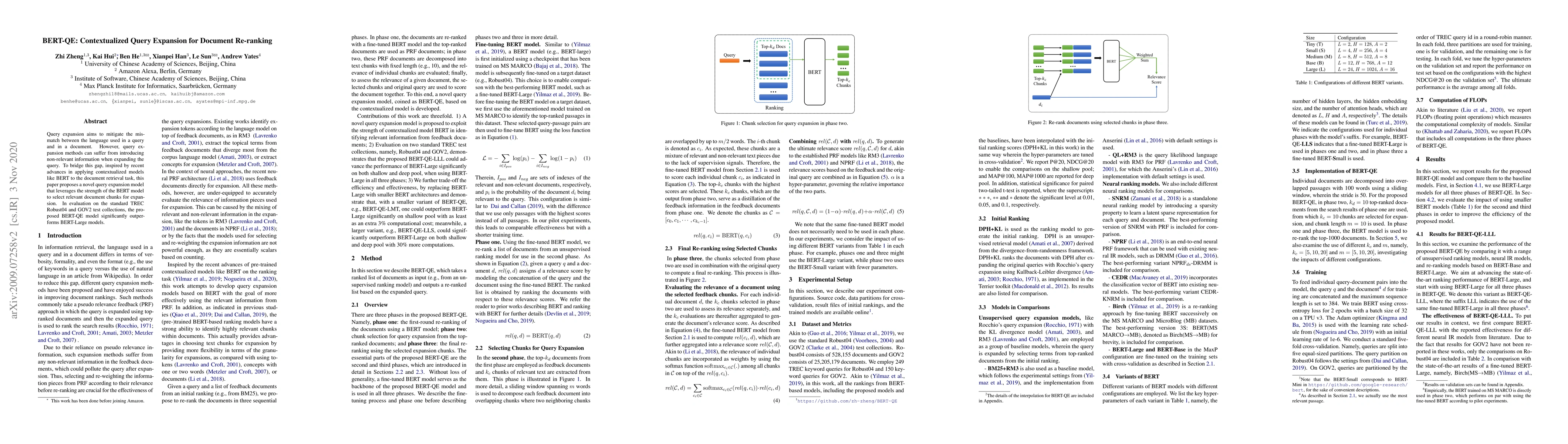 This paper proposes BERT-QE, a contextualized query expansion model using BERT to select relevant document chunks, addressing the issue of non-relevant information in query expansion. Evaluations on TREC Robust04 and GOV2 show that BERT-QE significantly outperforms BERT-Large models in document re-ranking.