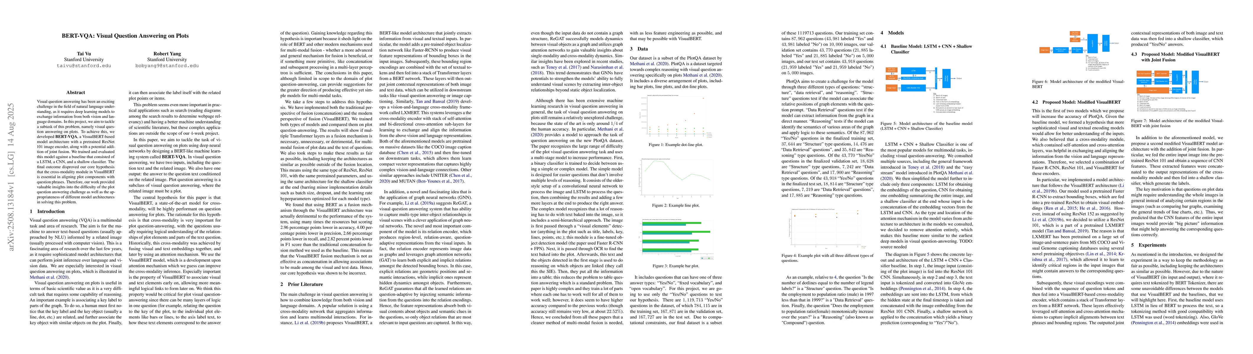 Visual question answering has been an exciting challenge in the field of natural language understanding, as it requires deep learning models to exchange information from both vision and language domains. In this project, we aim to tackle a subtask of this problem, namely visual question answering on plots. To achieve this, we developed BERT-VQA, a VisualBERT-based model architecture with a pretrained ResNet 101 image encoder, along with a potential addition of joint fusion. We trained and evaluated this model against a baseline that consisted of a LSTM, a CNN, and a shallow classifier. The final outcome disproved our core hypothesis that the cross-modality module in VisualBERT is essential in aligning plot components with question phrases. Therefore, our work provided valuable insights into the difficulty of the plot question answering challenge as well as the appropriateness of different model architectures in solving this problem.