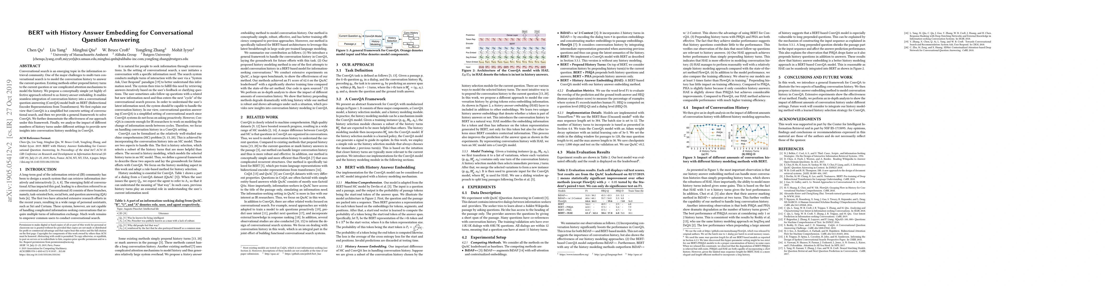 This paper proposes a simple yet effective approach to model conversation history in conversational question answering (ConvQA) using BERT with History Answer Embedding. It demonstrates the effectiveness of this approach under different settings and provides new insights into conversation history modeling.