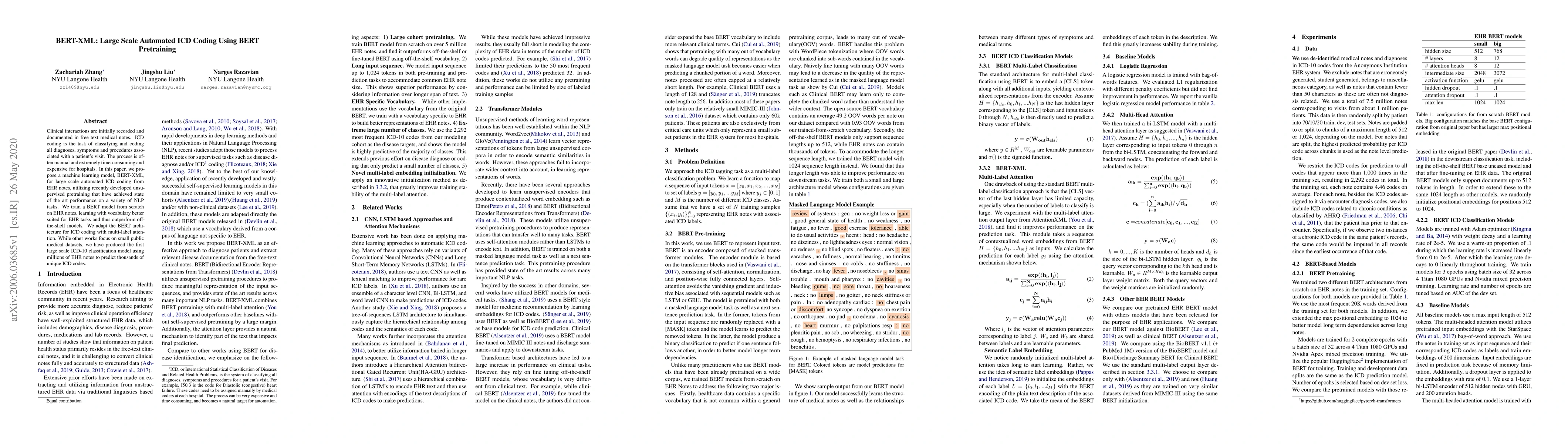 This paper introduces BERT-XML, a machine learning model for large-scale automated ICD coding from electronic health records (EHR) notes, leveraging BERT pretraining for superior performance. The authors train a customized BERT model on millions of EHR notes, achieving state-of-the-art results in classifying thousands of ICD codes.