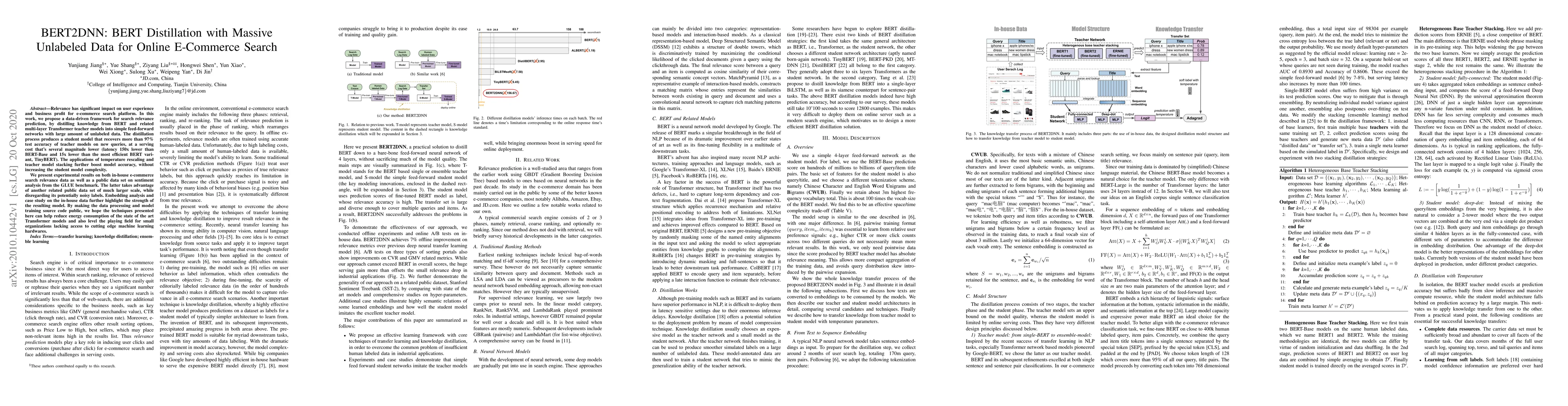 This paper proposes BERT2DNN, a framework for search relevance prediction in e-commerce by distilling knowledge from BERT into efficient feed-forward networks using large amounts of unlabeled data. The resulting student model achieves high accuracy with significantly lower latency compared to BERT.
