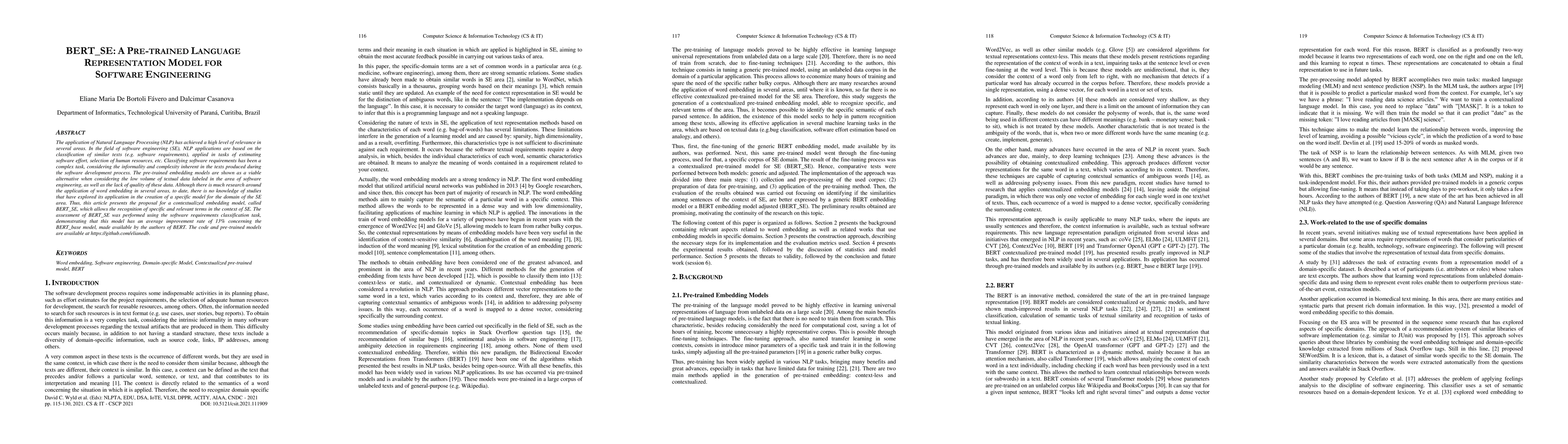 The application of Natural Language Processing (NLP) has achieved a high level of relevance in several areas. In the field of software engineering (SE), NLP applications are based on the classification of similar texts (e.g. software requirements), applied in tasks of estimating software effort, selection of human resources, etc. Classifying software requirements has been a complex task, considering the informality and complexity inherent in the texts produced during the software development process. The pre-trained embedding models are shown as a viable alternative when considering the low volume of textual data labeled in the area of software engineering, as well as the lack of quality of these data. Although there is much research around the application of word embedding in several areas, to date, there is no knowledge of studies that have explored its application in the creation of a specific model for the domain of the SE area. Thus, this article presents the proposal for a contextualized embedding model, called BERT_SE, which allows the recognition of specific and relevant terms in the context of SE. The assessment of BERT_SE was performed using the software requirements classification task, demonstrating that this model has an average improvement rate of 13% concerning the BERT_base model, made available by the authors of BERT. The code and pre-trained models are available at https://github.com/elianedb.