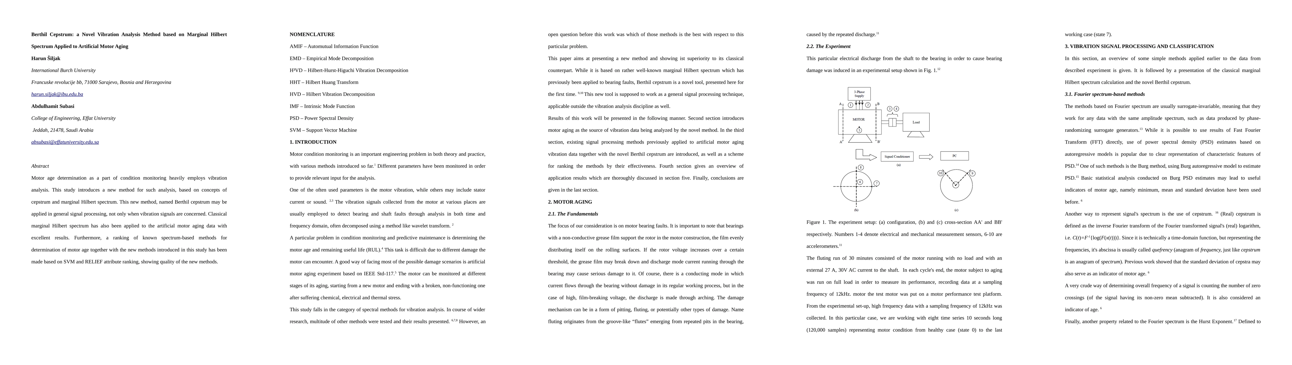 Motor age determination as a part of condition monitoring heavily employs vibration analysis. This study introduces a new method for such analysis, based on concepts of cepstrum and marginal Hilbert spectrum. This new method, named Berthil cepstrum may be applied in general signal processing, not only when vibration signals are concerned. Classical marginal Hilbert spectrum has also been applied to the artificial motor aging data with excellent results. Furthermore, a ranking of known spectrum-based methods for determination of motor age together with the new methods introduced in this study has been made based on SVM and RELIEF attribute ranking, showing quality of the new methods.