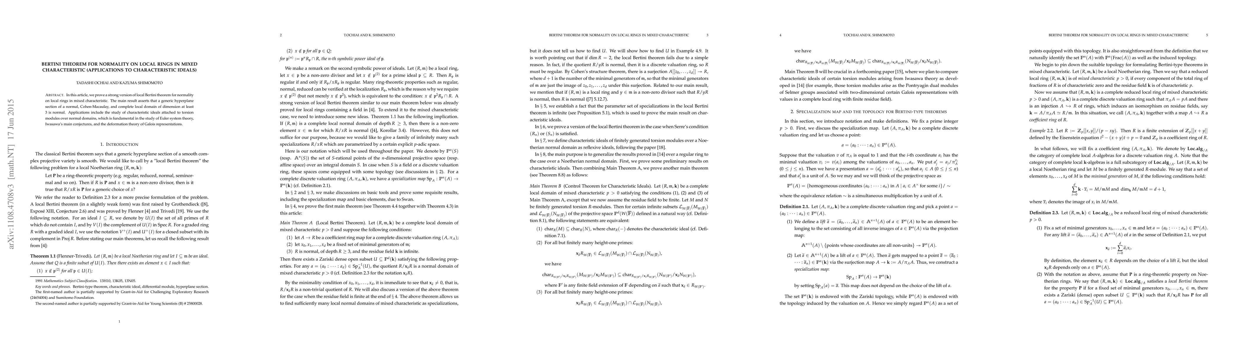 The paper proves a strengthened local Bertini theorem for normality in mixed characteristic, showing that a generic hyperplane section of a normal, Cohen-Macaulay, complete local domain of dimension at least 3 remains normal. Applications explore characteristic ideals for torsion modules over Noetherian normal domains, relevant to Euler system theory and Iwasawa main conjectures.