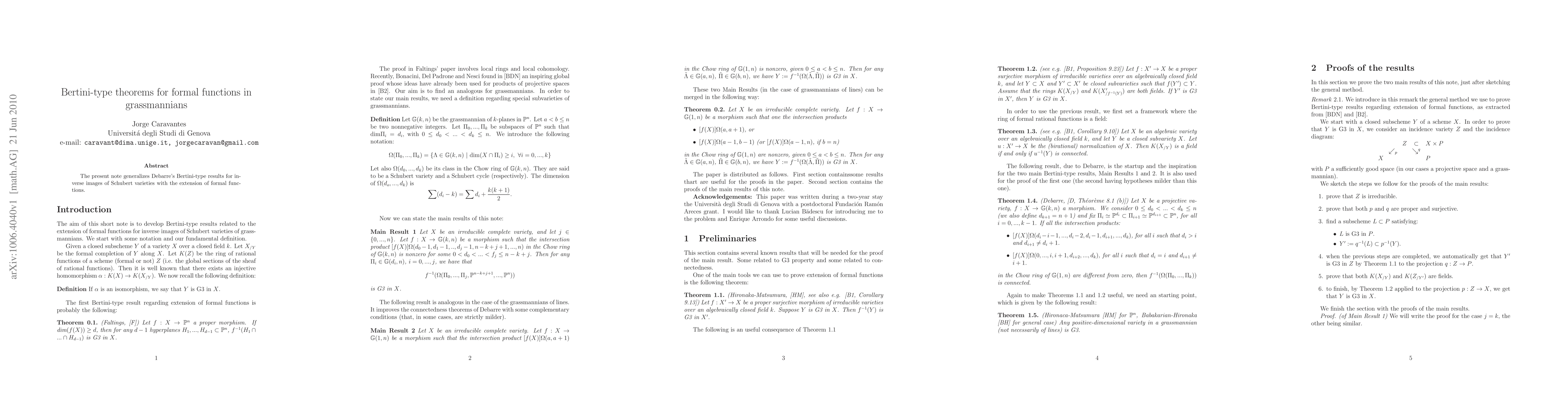 Summary: This paper extends Bertini-type theorems to formal functions in Grassmannians, generalizing Debarre's results for inverse images of Schubert varieties. The focus is on the behavior of these formal functions under certain geometric transformations.