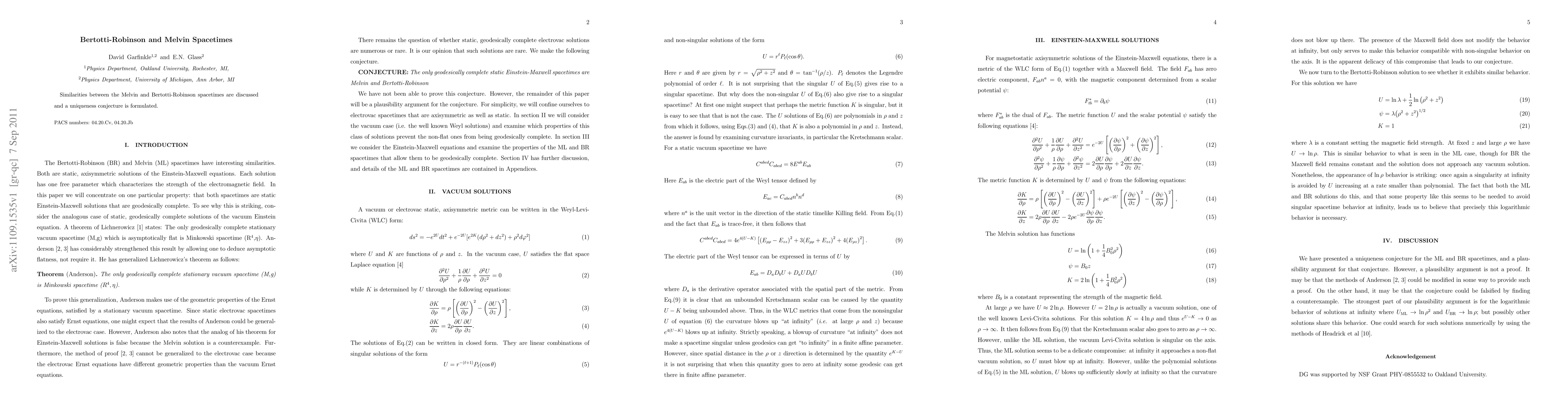 Summary: This paper explores the similarities between the Melvin and Bertotti-Robinson spacetimes, proposing a conjecture regarding their uniqueness and potential equivalence in certain physical contexts.