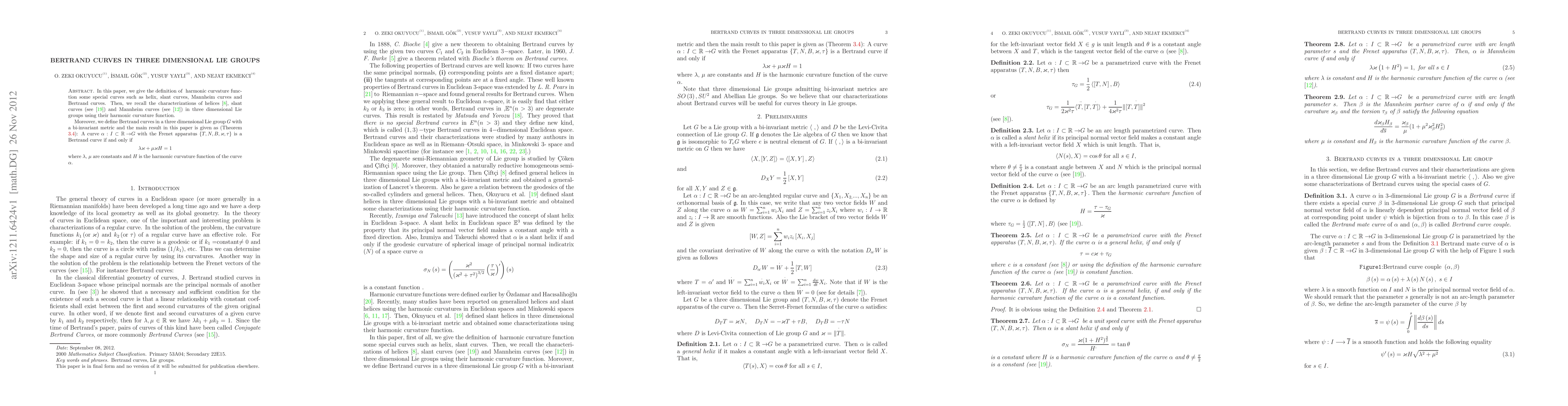 This paper defines special curves like helices, slant curves, Mannheim curves, and Bertrand curves in three-dimensional Lie groups using their harmonic curvature function. It concludes with a theorem stating that a curve in a Lie group is a Bertrand curve if it satisfies the condition λκ + μκH = 1, where λ, μ are constants and H is the harmonic curvature function.