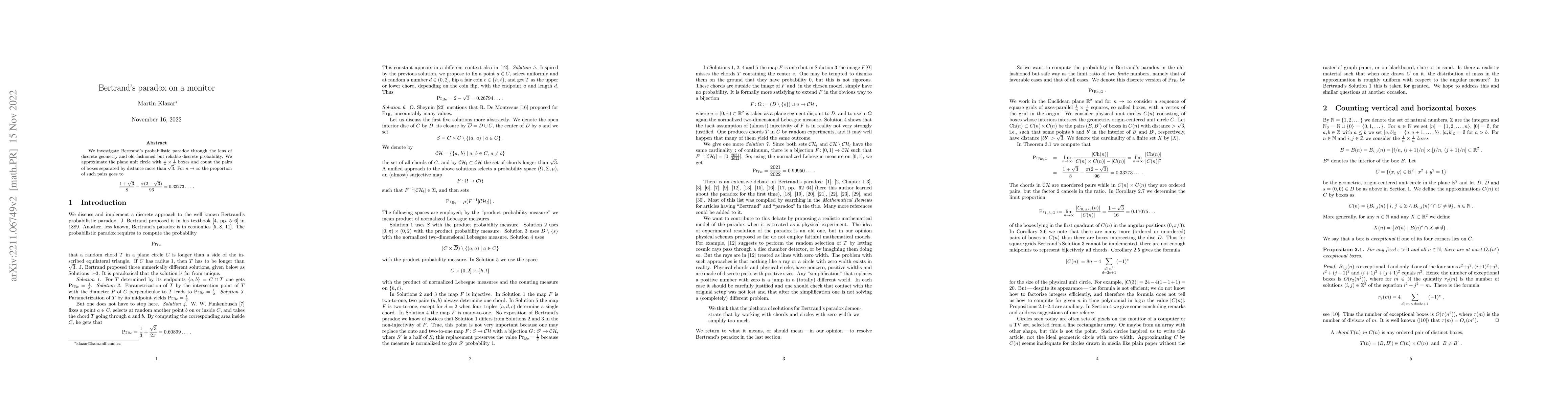 We investigate Bertrand's probabilistic paradox through the lens of discrete geometry and old-fashioned but reliable discrete probability. We approximate the plane unit circle with $1/n$ times $1/n$ boxes and count the pairs of boxes separated by distance more than $\sqrt{3}$. For $n\to\infty$ the proportion of such pairs goes to $$ \frac{1+\sqrt{3}}{8}-\frac{\pi(2-\sqrt{3})}{96}=0.33273\dots\;. $$