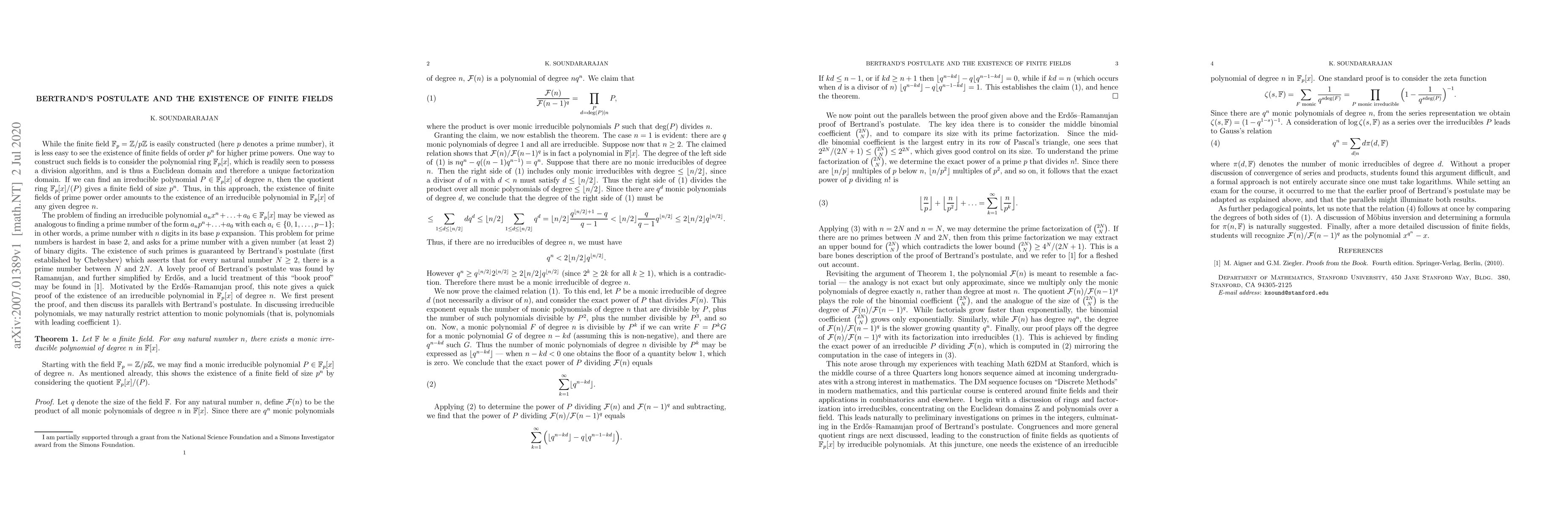 Summary: This paper explores how the Erdős-Ramanujan proof of Bertrand's postulate can be adapted to demonstrate the existence of finite fields, linking number theory and finite field theory in an expository manner.