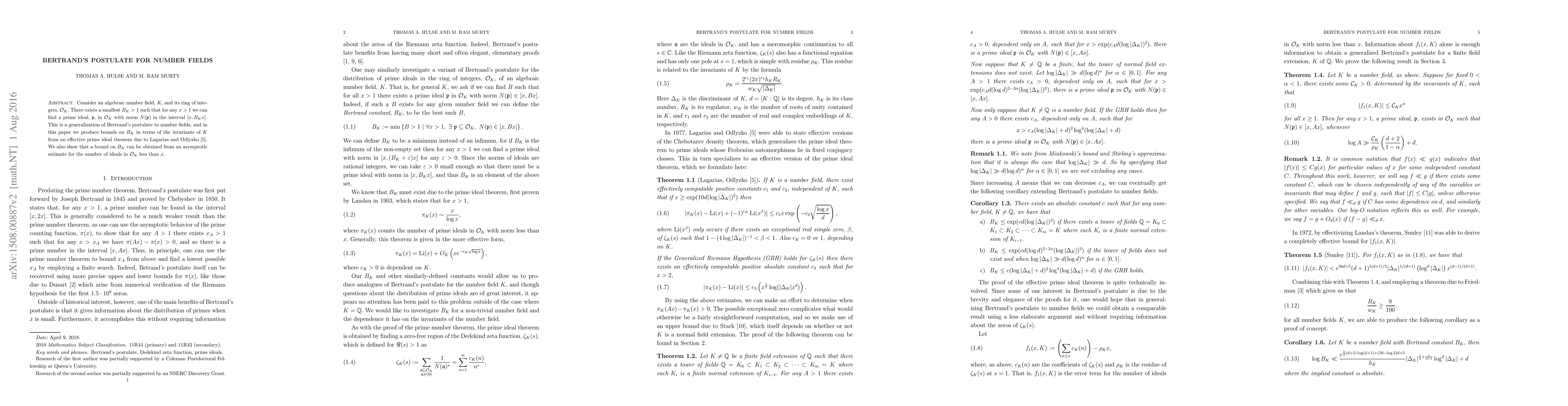 Consider an algebraic number field, $K$, and its ring of integers, $\mathcal{O}_K$. There exists a smallest $B_K>1$ such that for any $x>1$ we can find a prime ideal, $\mathfrak{p}$, in $\mathcal{O}_K$ with norm $N(\mathfrak{p})$ in the interval $[x,B_Kx]$. This is a generalization of Bertrand's postulate to number fields, and in this paper we produce bounds on $B_K$ in terms of the invariants of $K$ from an effective prime ideal theorem due to Lagarias and Odlyzko. We also show that a bound on $B_K$ can be obtained from an asymptotic estimate for the number of ideals in $\mathcal{O}_K$ less than $x$.