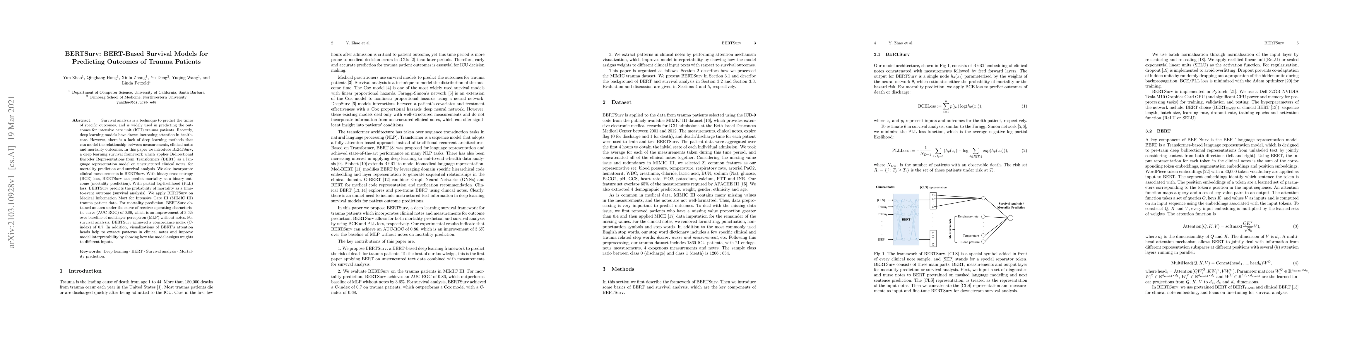 BERTSurv is a deep learning framework that uses BERT for mortality prediction and survival analysis in ICU trauma patients by integrating unstructured clinical notes and clinical measurements. It outperforms baseline models, achieving an AUC-ROC of 0.86 for mortality prediction and a C-index of 0.7 for survival analysis, while also enhancing interpretability through attention visualization.