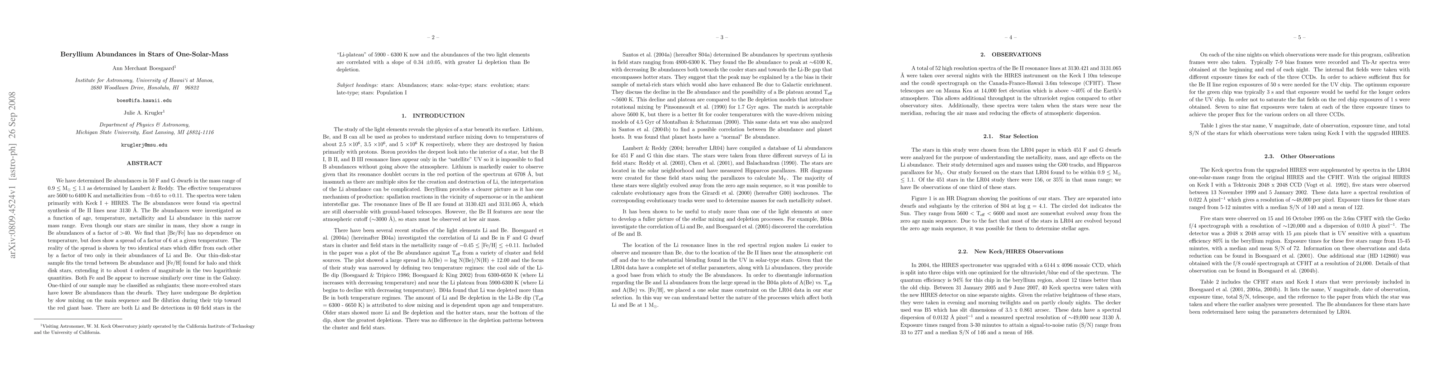 We have determined Be abundances in 50 F and G dwarfs in the mass range of 0.9 $\leq$ M$_\odot$ $\leq$ 1.1 as determined by Lambert & Reddy. The effective temperatures are 5600 to 6400 K and metallicities from $-$0.65 to +0.11. The spectra were taken primarily with Keck I + HIRES. The Be abundances were found via spectral synthesis of Be II lines near 3130 \AA. The Be abundances were investigated as a function of age, temperature, metallicity and Li abundance in this narrow mass range. Even though our stars are similar in mass, they show a range in Be abundances of a factor of $>$40. We find that [Be/Fe] has no dependence on temperature, but does show a spread of a factor of 6 at a given temperature. The reality of the spread is shown by two identical stars which differ from each other by a factor of two only in their abundances of Li and Be. Our thin-disk-star sample fits the trend between Be abundance and [Fe/H] found for halo and thick disk stars, extending it to about 4 orders of magnitude in the two logarithmic quantities. Both Fe and Be appear to increase similarly over time in the Galaxy. One-third of our sample may be classified as subgiants; these more-evolved stars have lower Be abundances than the dwarfs. They have undergone Be depletion by slow mixing on the main sequence and Be dilution during their trip toward the red giant base. There are both Li and Be detections in 60 field stars in the "Li-plateau" of 5900 - 6300 K now and the abundances of the two light elements are correlated with a slope of 0.34 $\pm$0.05, with greater Li depletion than Be depletion.
