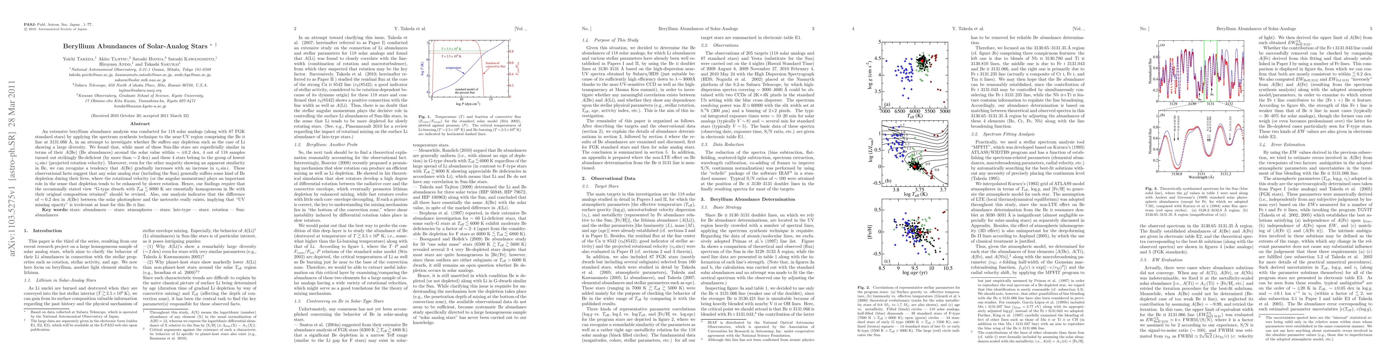 This study analyzed beryllium abundances in 118 solar analog stars, finding that while most are similar to the Sun, four stars show significant beryllium depletion linked to slower rotation. The findings suggest a general beryllium depletion in solar analogs, influenced by rotational velocity, and indicate a ~0.2 dex difference in beryllium abundance between the solar photosphere and meteorites.
