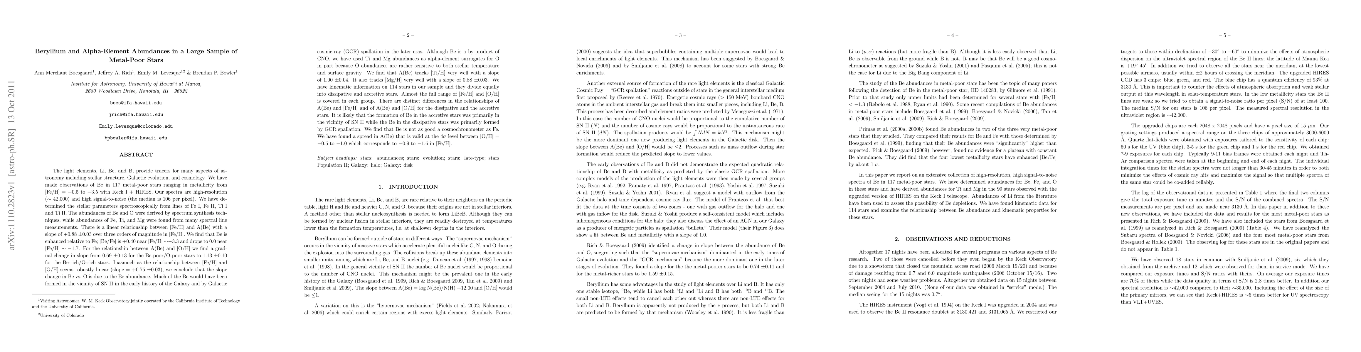 The light elements, Li, Be, and B, provide tracers for many aspects of astronomy including stellar structure, Galactic evolution, and cosmology. We have taken spectra of Be in 117 metal-poor stars ranging in metallicity from [Fe/H] = -0.5 to -3.5 with Keck I + HIRES at a resolution of 42,000 and signal-to-noise ratios of near 100. We have determined the stellar parameters spectroscopically from lines of Fe I, Fe II, Ti I and Ti II. The abundances of Be and O were derived by spectrum synthesis techniques, while abundances of Fe, Ti, and Mg were found from many spectral line measurements. There is a linear relationship between [Fe/H] and A(Be) with a slope of +0.88 +-0.03 over three orders of magnitude in [Fe/H]. We fit the relationship between A(Be) and [O/H] with both a single slope and with two slopes. The relationship between [Fe/H] and [O/H] seems robustly linear and we conclude that the slope change in Be vs. O is due to the Be abundance. Although Be is a by-product of CNO, we have used Ti and Mg abundances as alpha-element surrogates for O in part because O abundances are rather sensitive to both stellar temperature and surface gravity. We find that A(Be) tracks [Ti/H] very well with a slope of 1.00 +-0.04. It also tracks [Mg/H] very well with a slope of 0.88 +-0.03. We find that there are distinct differences in the relationships of A(Be) and [Fe/H] and of A(Be) and [O/H] for our dissipative stars and our accretive stars. We suggest that the Be in the dissipative stars was primarily formed by GCR spallation and Be in the accretive stars was formed in the vicinity of SN II.