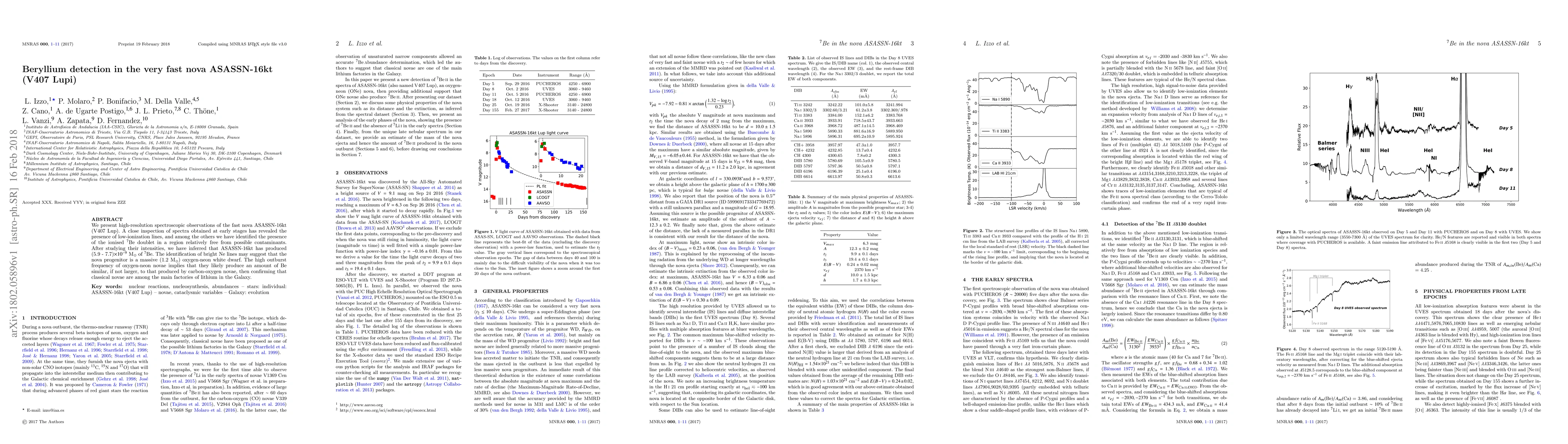 We present high-resolution spectroscopic observations of the fast nova ASASSN-16kt (V407 Lup). A close inspection of spectra obtained at early stages has revealed the presence of low-ionization lines, and among the others we have identified the presence of the ionised $^7$Be doublet in a region relatively free from possible contaminants. After studying their intensities, we have inferred that ASASSN-16kt has produced (5.9 - 7.7)$ \times 10^{-9}$ M$_{\odot}$ of $^7$Be. The identification of bright Ne lines may suggest that the nova progenitor is a massive (1.2 M$_{\odot}$) oxygen-neon white dwarf. The high outburst frequency of oxygen-neon novae implies that they likely produce an amount of Be similar, if not larger, to that produced by carbon-oxygen novae, then confirming that classical novae are among the main factories of lithium in the Galaxy.