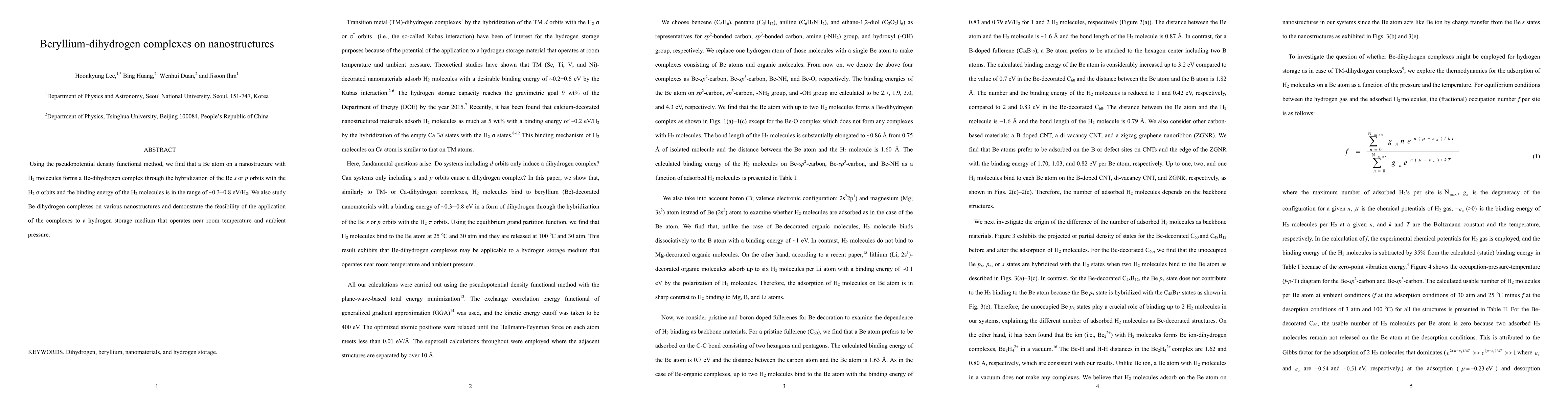 This study reveals that beryllium atoms on nanostructures form Be-dihydrogen complexes via hybridization, with binding energies of 0.3 - 0.8 eV/H2, suggesting potential for room-temperature hydrogen storage.