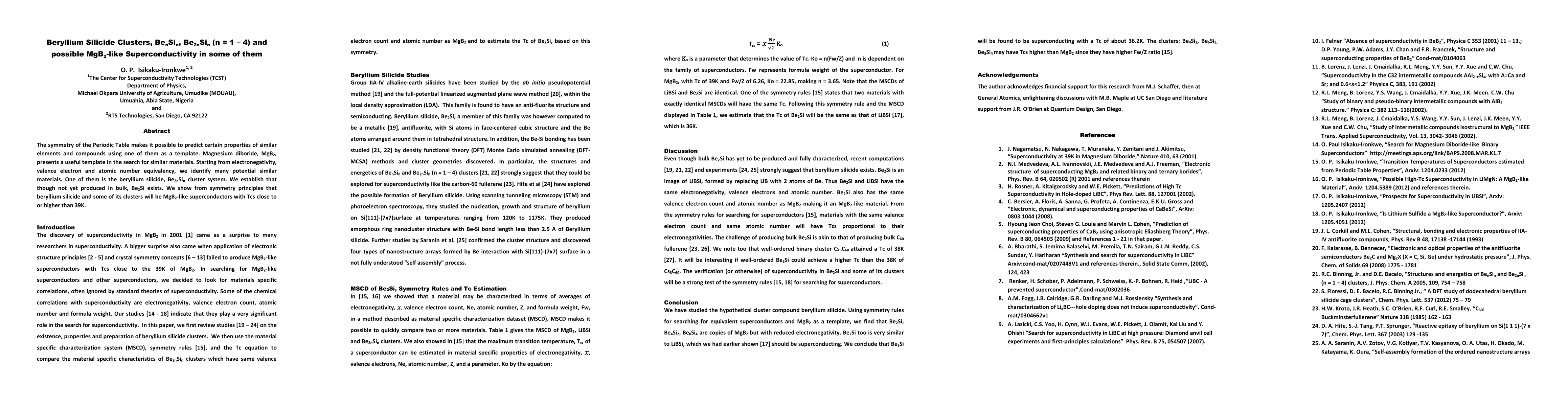 The symmetry of the Periodic Table makes it possible to predict certain properties of similar elements and compounds using one of them as a template. Magnesium diboride, MgB2, presents a useful template in the search for similar materials. Starting from electronegativity, valence electron and atomic number equivalency, we identify many potential similar materials. One of them is the beryllium silicide, Be2nSin cluster system. We establish that though not yet produced in bulk, Be2Si exists. We show from symmetry principles that beryllium silicide and some of its clusters will be MgB2-like superconductors with Tcs close to or higher than 39K.