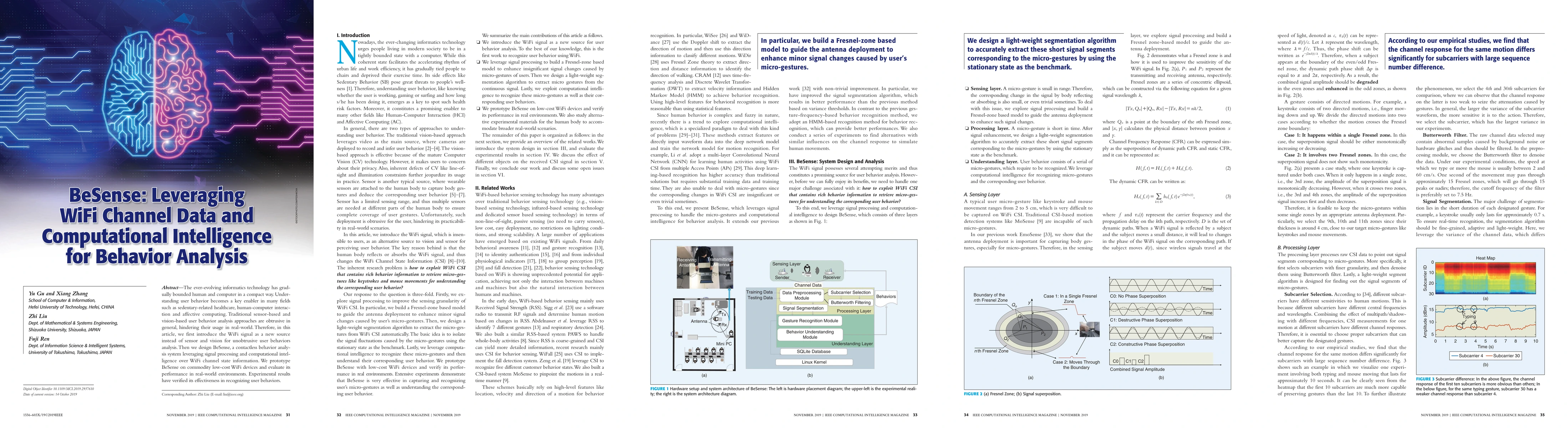 Title: BeSense: Leveraging WiFi Channel Data and Computational Intelligence for Behavior Analysis Summary: This paper introduces BeSense, a contactless system using WiFi channel state information (CSI) for unobtrusive user behavior analysis, demonstrating its effectiveness through real-world evaluations.