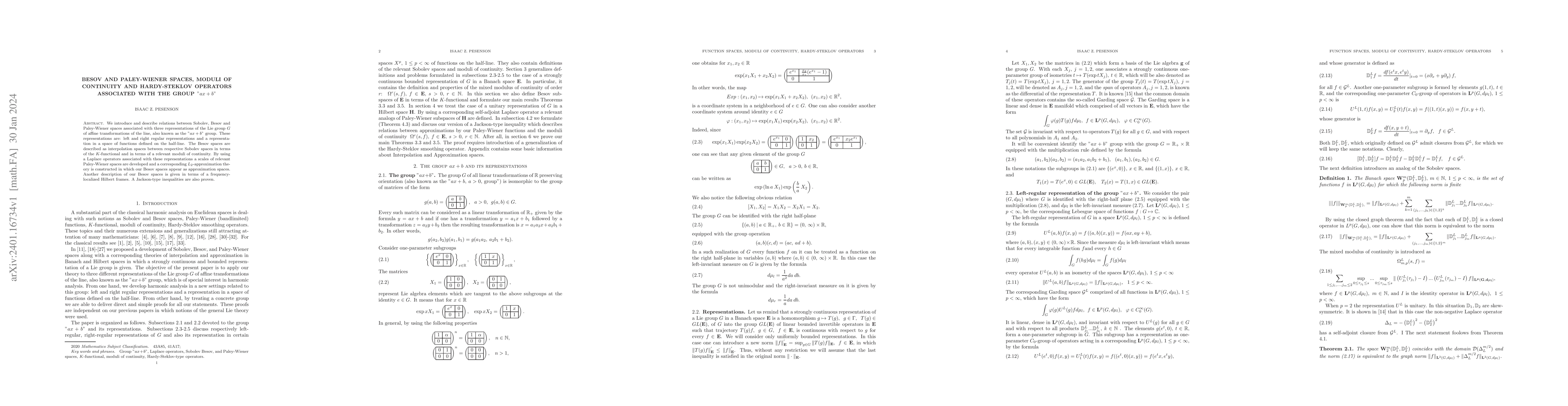 We introduce and describe relations between Sobolev, Besov and Paley-Wiener spaces associated with three representations of the Lie group of affine transformations of the line. These representations are left and right regular representations and a representation in a space of functions defined on the half-line. The Besov spaces are described as interpolation spaces between respective Sobolev spaces in terms of the Petree's real interpolation method and in terms of a relevant moduli of continuity. By using a Laplace operators associated with these representations a scales of relevant Paley-Wiener spaces are developed and a corresponding $L_{2}$-approximation theory is constructed in which our Besov spaces appear as approximation spaces. Another description of our Besov spaces is given in terms of a frequency-localized Hilbert frames. A Jackson-type inequalities are also proven.