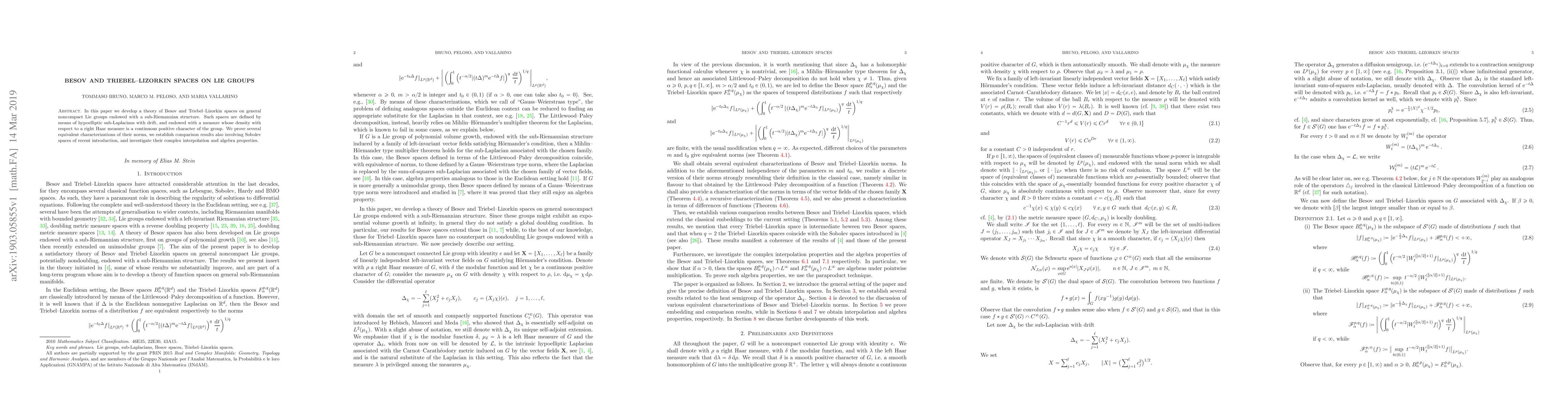 In this paper we develop a theory of Besov and Triebel--Lizorkin spaces on general noncompact Lie groups endowed with a sub-Riemannian structure. Such spaces are defined by means of hypoelliptic sub-Laplacians with drift, and endowed with a measure whose density with respect to a right Haar measure is a continuous positive character of the group. We prove several equivalent characterizations of their norms, we establish comparison results also involving Sobolev spaces of recent introduction, and investigate their complex interpolation and algebra properties.