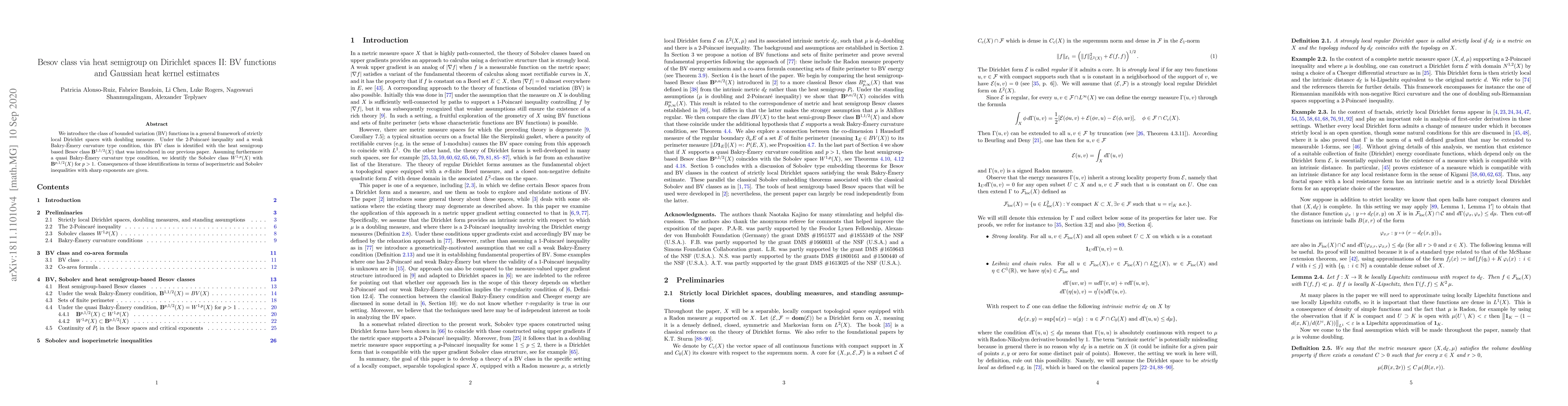 This paper establishes the equivalence between bounded variation (BV) functions and a heat semigroup-based Besov class in strictly local Dirichlet spaces, under certain geometric conditions. It also identifies the Sobolev class with another Besov class under a quasi Bakry-Émery curvature condition, providing implications for isoperimetric and Sobolev inequalities.