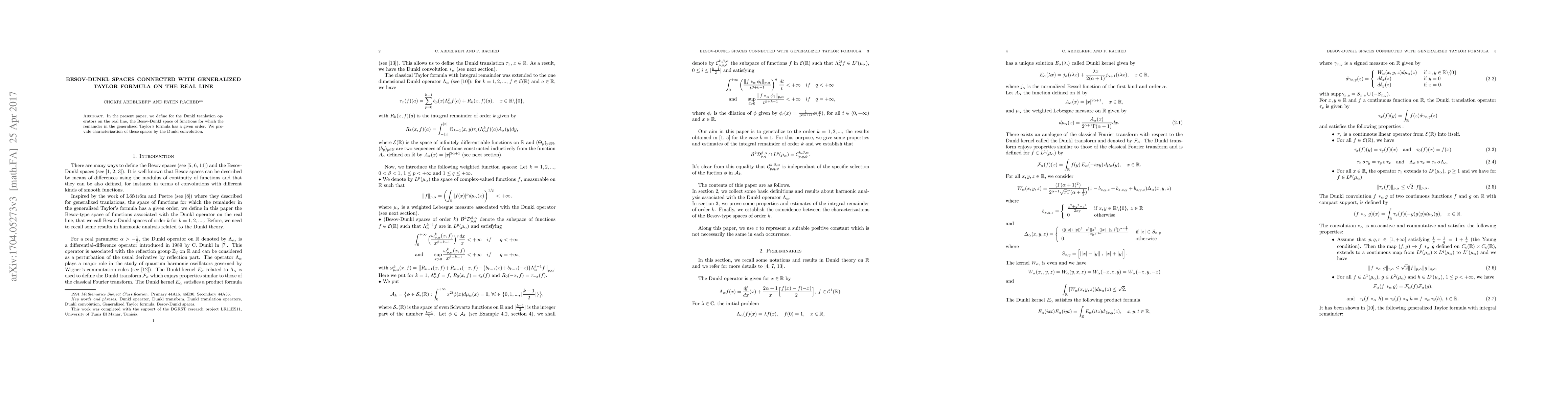 This paper introduces Besov-Dunkl spaces related to Dunkl translation operators on the real line, characterized by the order of remainder in the generalized Taylor's formula. These spaces are defined and described using Dunkl convolution.