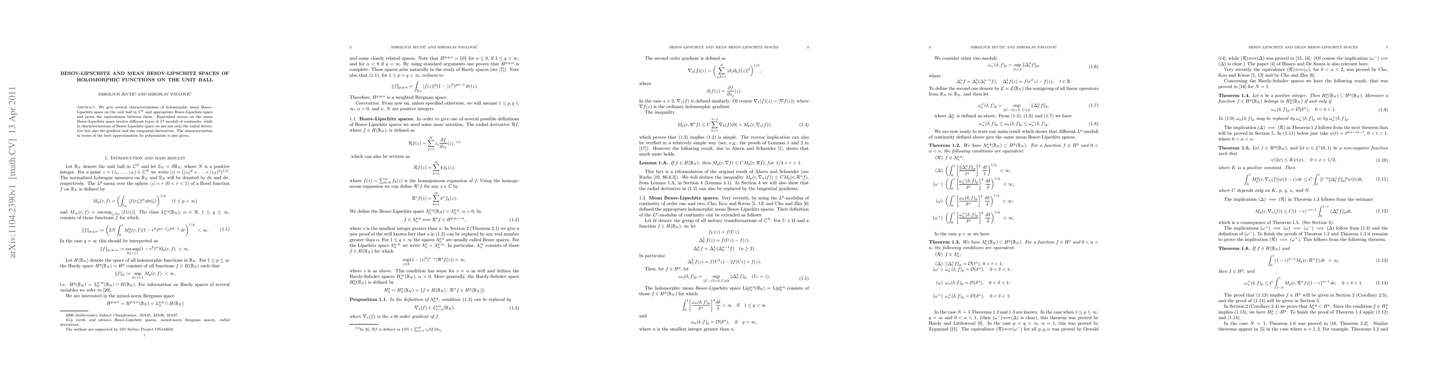 We give several characterizations of holomorphic mean Besov-Lipschitz space on the unit ball in $\cn $ and appropriate Besov-Lipschitz space and prove the equivalences between them. Equivalent norms on the mean Besov-Lipschitz space involve different types of $L^p$-moduli of continuity, while in characterizations of Besov-Lipschitz space we use not only the radial derivative but also the gradient and the tangential derivatives. The characterization in terms of the best approximation by polynomials is also given.