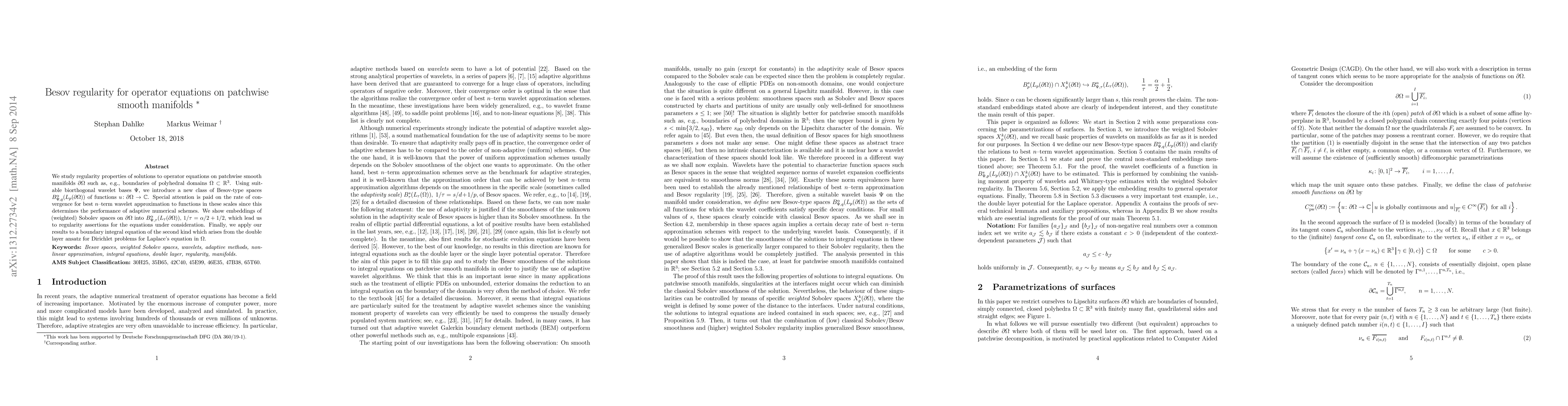 We study regularity properties of solutions to operator equations on patchwise smooth manifolds $\partial\Omega$ such as, e.g., boundaries of polyhedral domains $\Omega \subset \mathbb{R}^3$. Using suitable biorthogonal wavelet bases $\Psi$, we introduce a new class of Besov-type spaces $B_{\Psi,q}^\alpha(L_p(\partial \Omega))$ of functions $u\colon\partial\Omega\rightarrow\mathbb{C}$. Special attention is paid on the rate of convergence for best $n$-term wavelet approximation to functions in these scales since this determines the performance of adaptive numerical schemes. We show embeddings of (weighted) Sobolev spaces on $\partial\Omega$ into $B_{\Psi,\tau}^\alpha(L_\tau(\partial \Omega))$, $1/\tau=\alpha/2 + 1/2$, which lead us to regularity assertions for the equations under consideration. Finally, we apply our results to a boundary integral equation of the second kind which arises from the double layer ansatz for Dirichlet problems for Laplace's equation in $\Omega$.