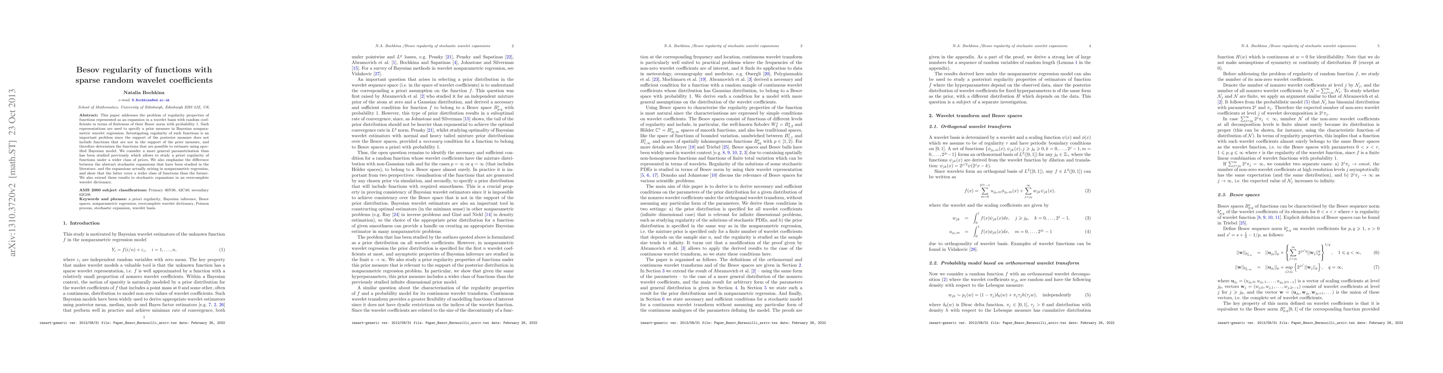 This paper examines the regularity properties of functions with sparse random wavelet coefficients in terms of their Besov norm, crucial for Bayesian nonparametric wavelet regression. It extends previous studies by considering a broader class of priors and highlights the differences between theoretical stochastic expansions and those used in nonparametric regression.