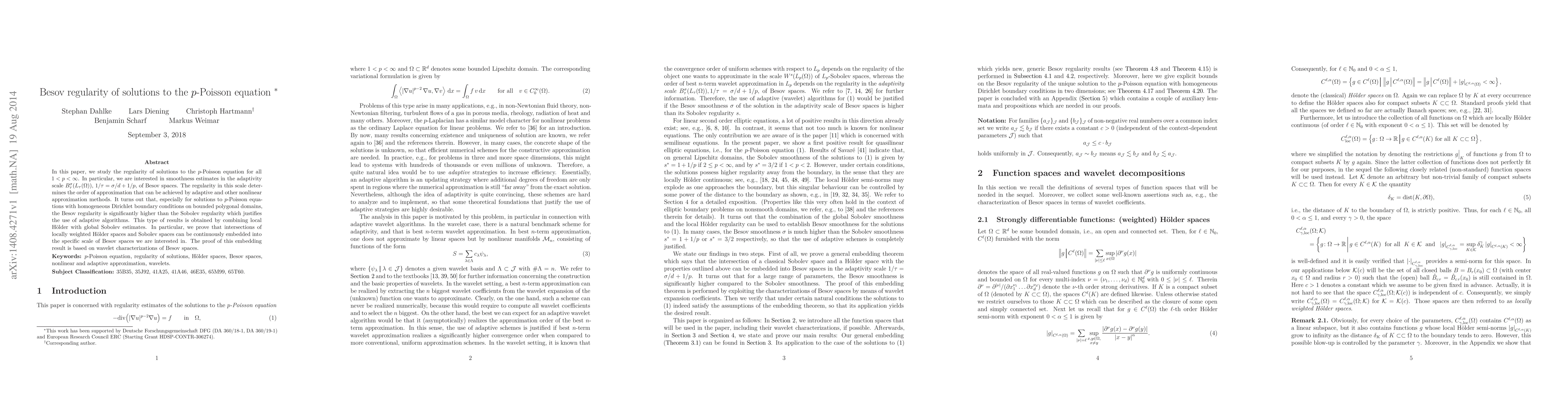 This paper investigates the Besov regularity of solutions to the $p$-Poisson equation, demonstrating that solutions exhibit higher regularity in Besov spaces compared to Sobolev spaces, which supports the use of adaptive algorithms for approximation. The proof leverages wavelet characterizations and embeddings of H\"older and Sobolev spaces into Besov spaces.