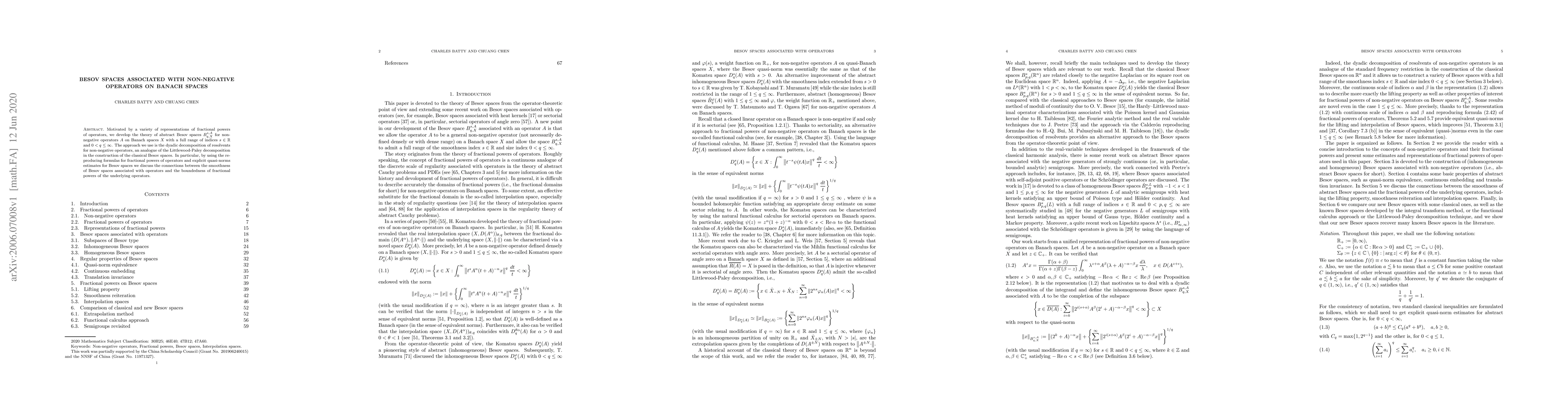 Motivated by a variety of representations of fractional powers of operators, we develop the theory of abstract Besov spaces $B^{ s, A }_{ q, X }$ for non-negative operators $A$ on Banach spaces $X$ with a full range of indices $s \in \mathbb{R}$ and $0 < q \leq \infty$. The approach we use is the dyadic decomposition of resolvents for non-negative operators, an analogue of the Littlewood-Paley decomposition in the construction of the classical Besov spaces. In particular, by using the reproducing formulas for fractional powers of operators and explicit quasi-norms estimates for Besov spaces we discuss the connections between the smoothness of Besov spaces associated with operators and the boundedness of fractional powers of the underlying operators.