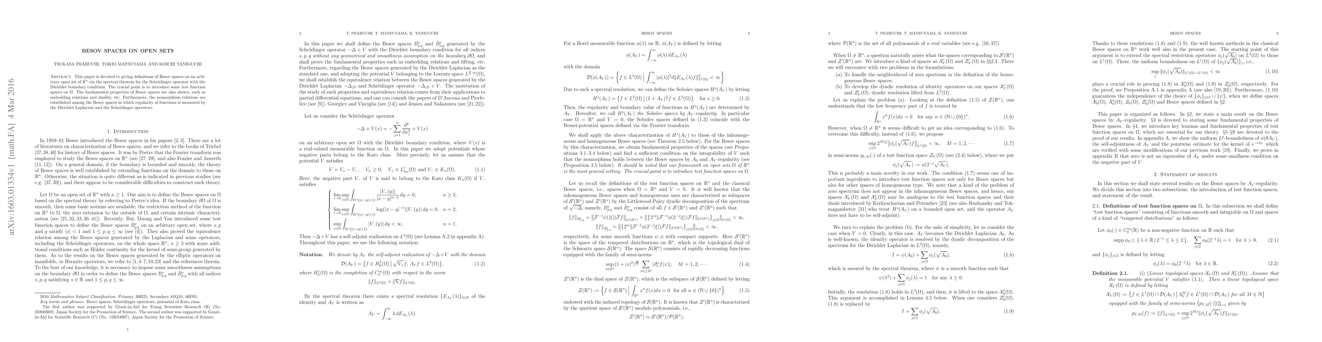 The paper introduces a novel approach to defining Besov spaces on open sets using the spectral theorem for the Schrödinger operator with Dirichlet boundary conditions, providing a comprehensive analysis of their properties and isomorphism relations.