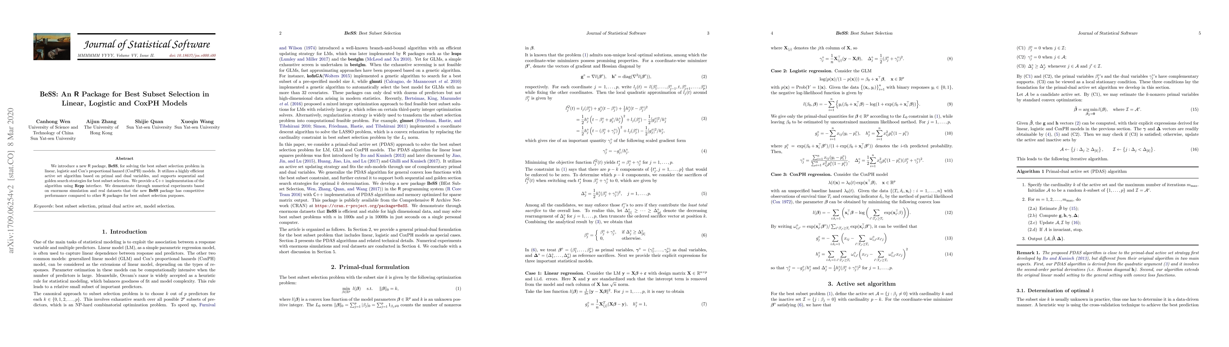 The new BeSS package provides a highly efficient active set algorithm for best subset selection in linear, logistic, and CoxPH models.