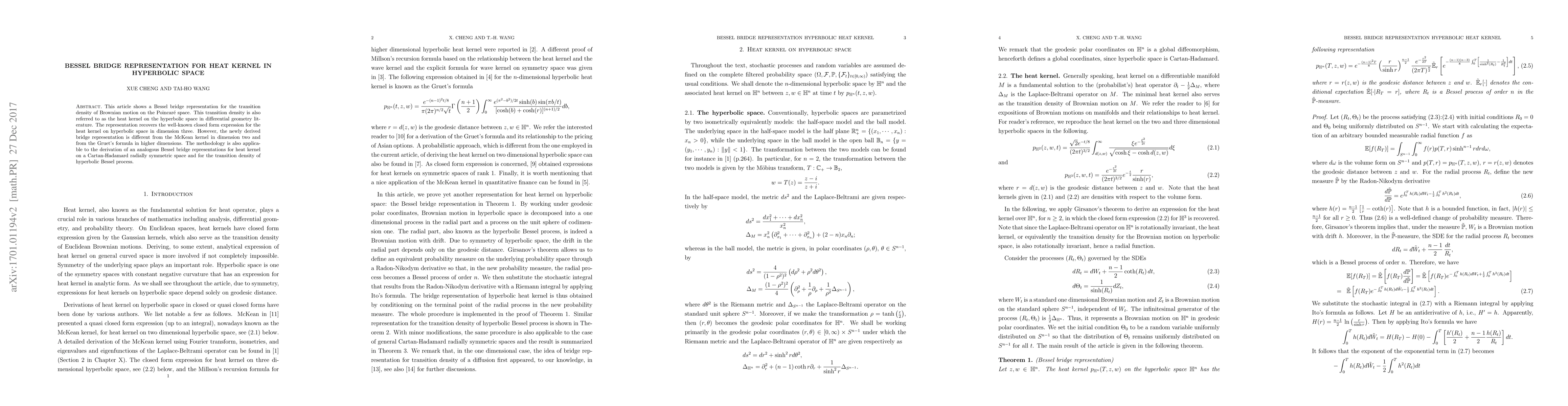 This paper presents a Bessel bridge representation for the heat kernel on hyperbolic space, recovering the known expression in three dimensions while differing from existing formulas in lower and higher dimensions. The methodology extends to analogous representations for heat kernels on radially symmetric spaces and the transition density of hyperbolic Bessel processes.