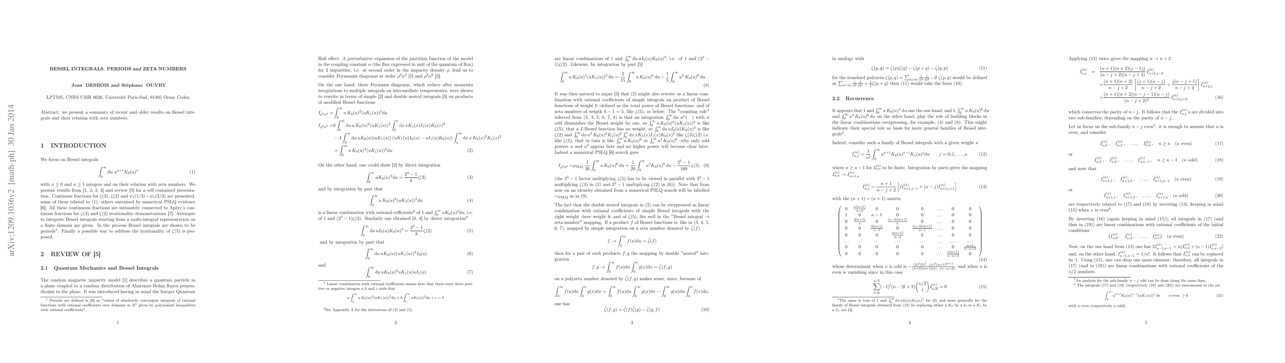We present a summary of recent and older results on Bessel integrals and their relation with zeta numbers.