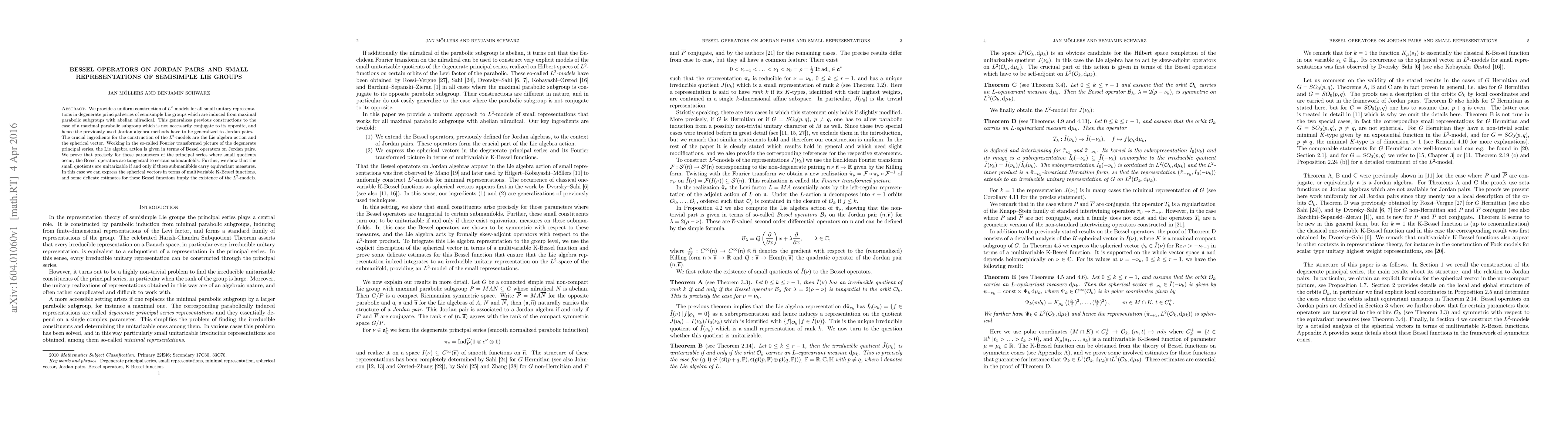We provide a uniform construction of $L^2$-models for all small unitary representations in degenerate principal series of semisimple Lie groups which are induced from maximal parabolic subgroups with abelian nilradical. This generalizes previous constructions to the case of a maximal parabolic subgroup which is not necessarily conjugate to its opposite, and hence the previously used Jordan algebra methods have to be generalized to Jordan pairs. The crucial ingredients for the construction of the $L^2$-models are the Lie algebra action and the spherical vector. Working in the so-called Fourier transformed picture of the degenerate principal series, the Lie algebra action is given in terms of Bessel operators on Jordan pairs. We prove that precisely for those parameters of the principal series where small quotients occur, the Bessel operators are tangential to certain submanifolds. Further, we show that the small quotients are unitarizable if and only if these submanifolds carry equivariant measures. In this case we can express the spherical vectors in terms of multivariable K-Bessel functions, and some delicate estimates for these Bessel functions imply the existence of the $L^2$-models.