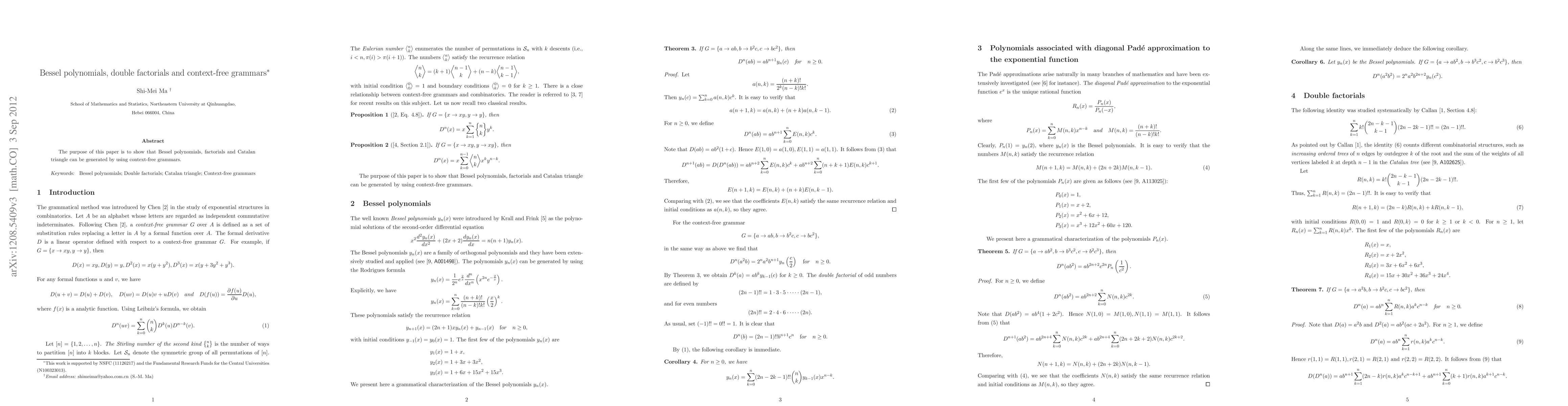 Summary: This paper demonstrates the generation of Bessel polynomials, double factorials, and Catalan triangles through the application of context-free grammars, illustrating a novel connection between combinatorial structures and formal language theory.