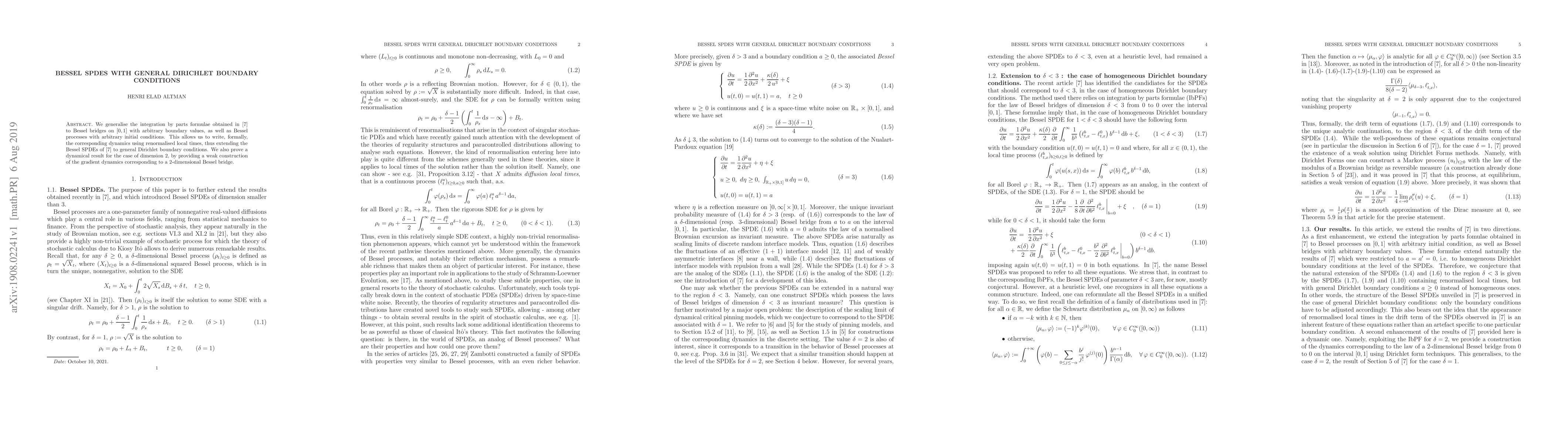 We generalise the integration by parts formulae obtained in arXiv:1811.00518v5 [math.PR] to Bessel bridges on $[0,1]$ with arbitrary boundary values, as well as Bessel processes with arbitrary initial conditions. This allows us to write, formally, the corresponding dynamics using renormalised local times, thus extending the Bessel SPDEs of arXiv:1811.00518v5 [math.PR] to general Dirichlet boundary conditions. We also prove a dynamical result for the case of dimension $2$, by providing a weak construction of the gradient dynamics corresponding to a $2$-dimensional Bessel bridge.