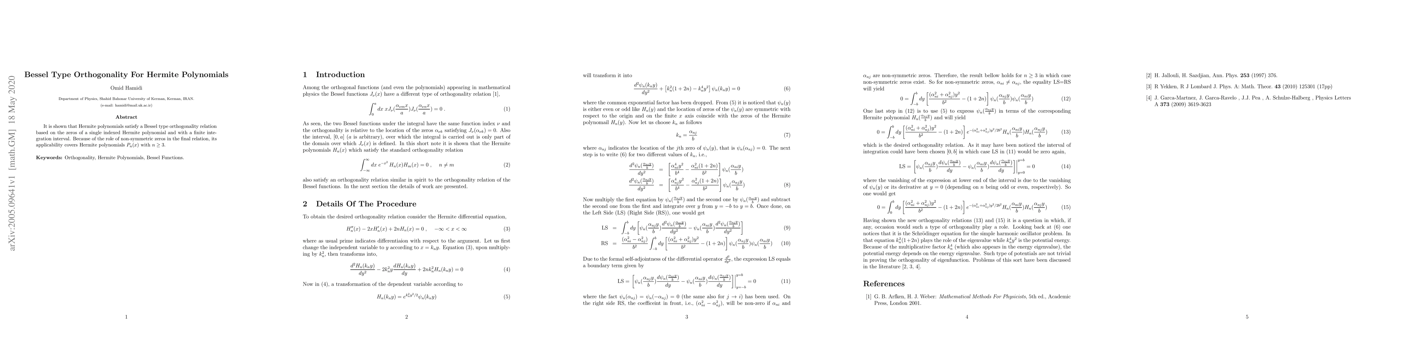 This paper demonstrates that Hermite polynomials exhibit a Bessel type orthogonality relation based on the zeros of a single index Hermite polynomial, with applicability to polynomials $P_n(x)$ for $n \geq 3$. The relation is defined over a finite integration interval.