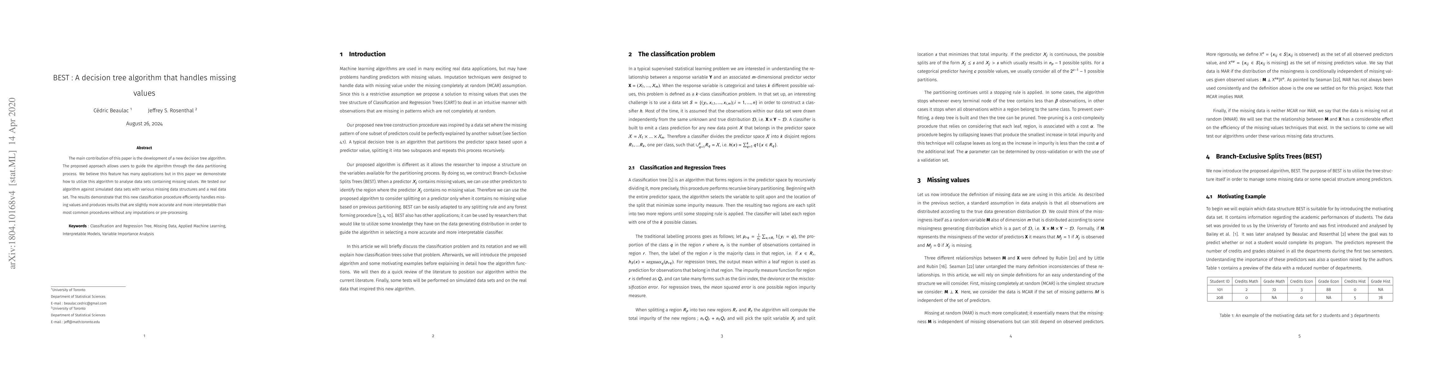 This paper introduces a new decision tree algorithm that efficiently handles missing values in datasets, achieving slightly more accurate results without imputation or pre-processing.