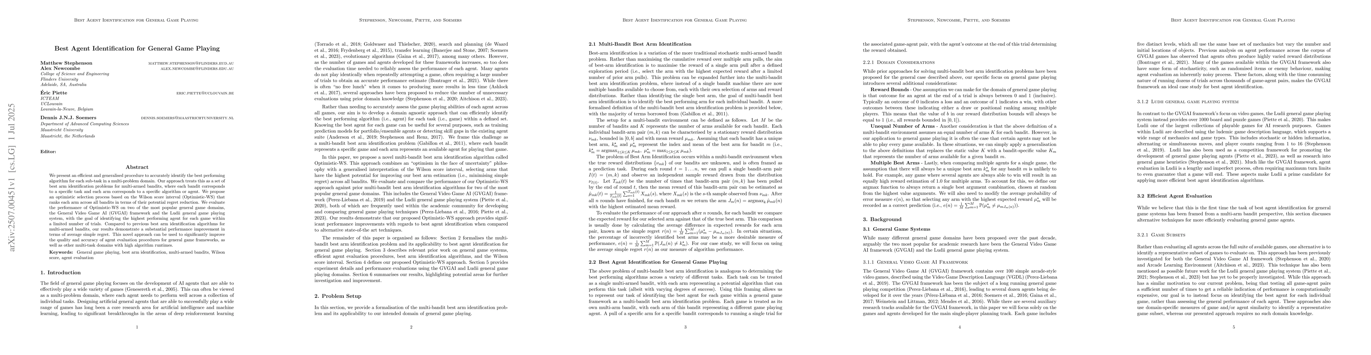 We present an efficient and generalised procedure to accurately identify the best performing algorithm for each sub-task in a multi-problem domain. Our approach treats this as a set of best arm identification problems for multi-armed bandits, where each bandit corresponds to a specific task and each arm corresponds to a specific algorithm or agent. We propose an optimistic selection process based on the Wilson score interval (Optimistic-WS) that ranks each arm across all bandits in terms of their potential regret reduction. We evaluate the performance of Optimistic-WS on two of the most popular general game domains, the General Video Game AI (GVGAI) framework and the Ludii general game playing system, with the goal of identifying the highest performing agent for each game within a limited number of trials. Compared to previous best arm identification algorithms for multi-armed bandits, our results demonstrate a substantial performance improvement in terms of average simple regret. This novel approach can be used to significantly improve the quality and accuracy of agent evaluation procedures for general game frameworks, as well as other multi-task domains with high algorithm runtimes.