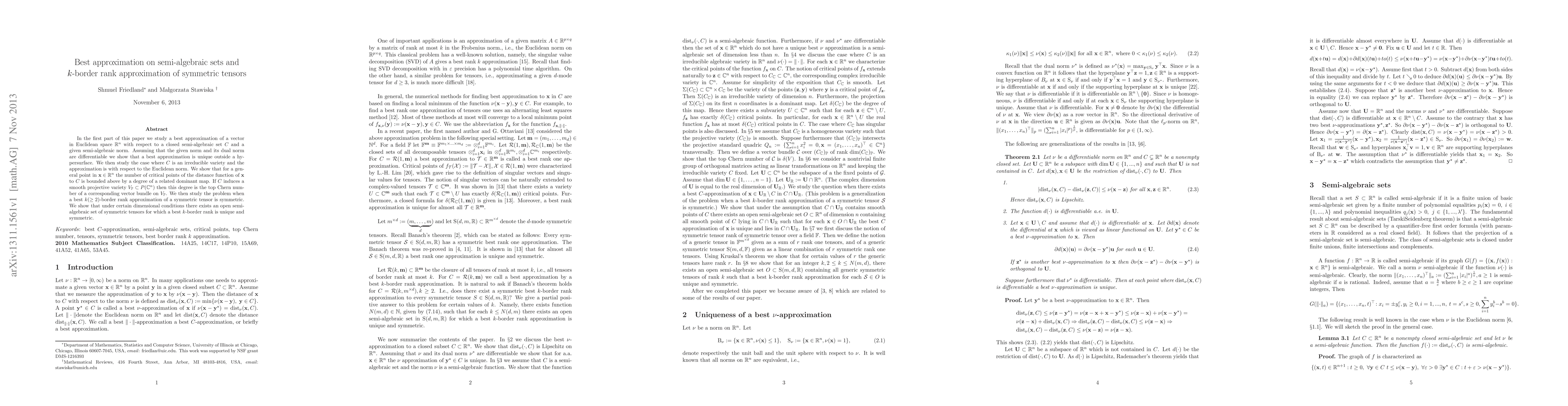This paper studies best approximation of vectors in Euclidean space to semi-algebraic sets, focusing on uniqueness and symmetry under certain conditions, with implications for tensor rank approximation.