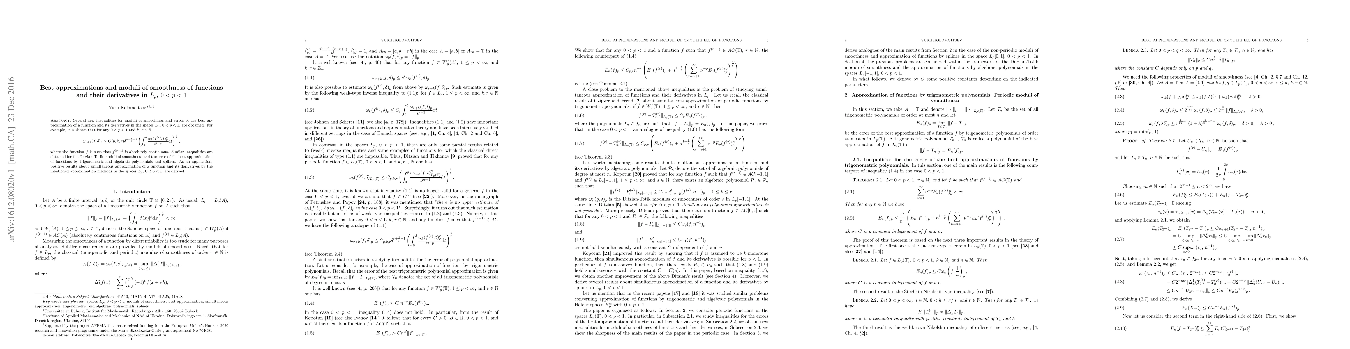 This paper presents new inequalities for moduli of smoothness and best approximation errors of functions and their derivatives in $L_p$ spaces where $0<p<1$. It establishes bounds involving Ditzian-Totik moduli and applies these results to simultaneous approximation by trigonometric and algebraic polynomials and splines.