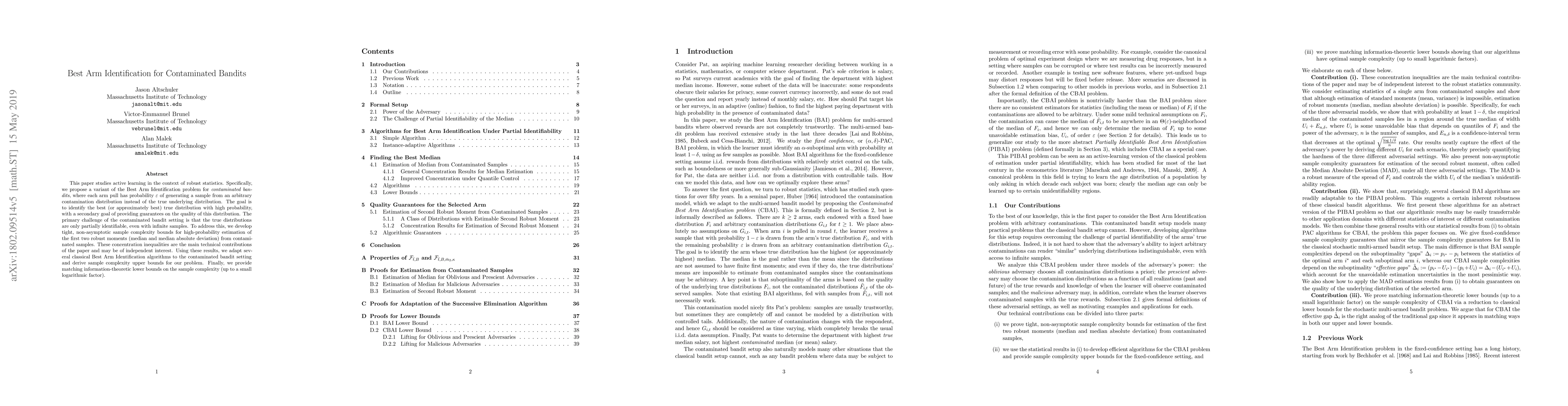 This paper studies active learning in the context of robust statistics. Specifically, we propose a variant of the Best Arm Identification problem for \emph{contaminated bandits}, where each arm pull has probability $\varepsilon$ of generating a sample from an arbitrary contamination distribution instead of the true underlying distribution. The goal is to identify the best (or approximately best) true distribution with high probability, with a secondary goal of providing guarantees on the quality of this distribution. The primary challenge of the contaminated bandit setting is that the true distributions are only partially identifiable, even with infinite samples. To address this, we develop tight, non-asymptotic sample complexity bounds for high-probability estimation of the first two robust moments (median and median absolute deviation) from contaminated samples. These concentration inequalities are the main technical contributions of the paper and may be of independent interest. Using these results, we adapt several classical Best Arm Identification algorithms to the contaminated bandit setting and derive sample complexity upper bounds for our problem. Finally, we provide matching information-theoretic lower bounds on the sample complexity (up to a small logarithmic factor).