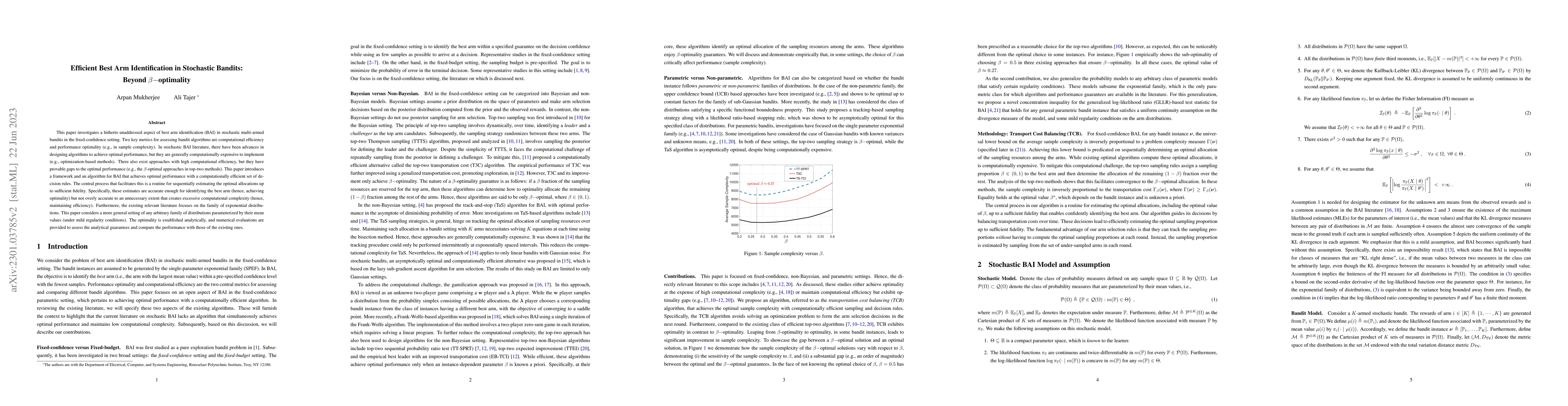 This paper investigates a hitherto unaddressed aspect of best arm identification (BAI) in stochastic multi-armed bandits in the fixed-confidence setting. Two key metrics for assessing bandit algorithms are computational efficiency and performance optimality (e.g., in sample complexity). In stochastic BAI literature, there have been advances in designing algorithms to achieve optimal performance, but they are generally computationally expensive to implement (e.g., optimization-based methods). There also exist approaches with high computational efficiency, but they have provable gaps to the optimal performance (e.g., the $\beta$-optimal approaches in top-two methods). This paper introduces a framework and an algorithm for BAI that achieves optimal performance with a computationally efficient set of decision rules. The central process that facilitates this is a routine for sequentially estimating the optimal allocations up to sufficient fidelity. Specifically, these estimates are accurate enough for identifying the best arm (hence, achieving optimality) but not overly accurate to an unnecessary extent that creates excessive computational complexity (hence, maintaining efficiency). Furthermore, the existing relevant literature focuses on the family of exponential distributions. This paper considers a more general setting of any arbitrary family of distributions parameterized by their mean values (under mild regularity conditions). The optimality is established analytically, and numerical evaluations are provided to assess the analytical guarantees and compare the performance with those of the existing ones.
