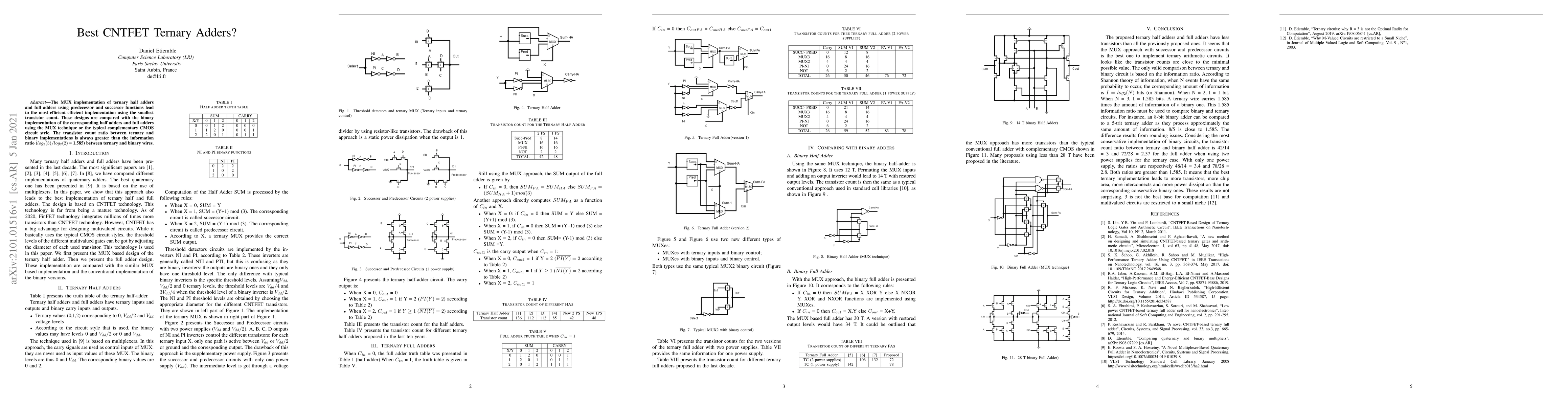 This paper explores efficient ternary adders using CNTFETs, demonstrating that ternary half and full adders, implemented via MUX, require fewer transistors than their binary counterparts, achieving a transistor count ratio of greater than 1.585.