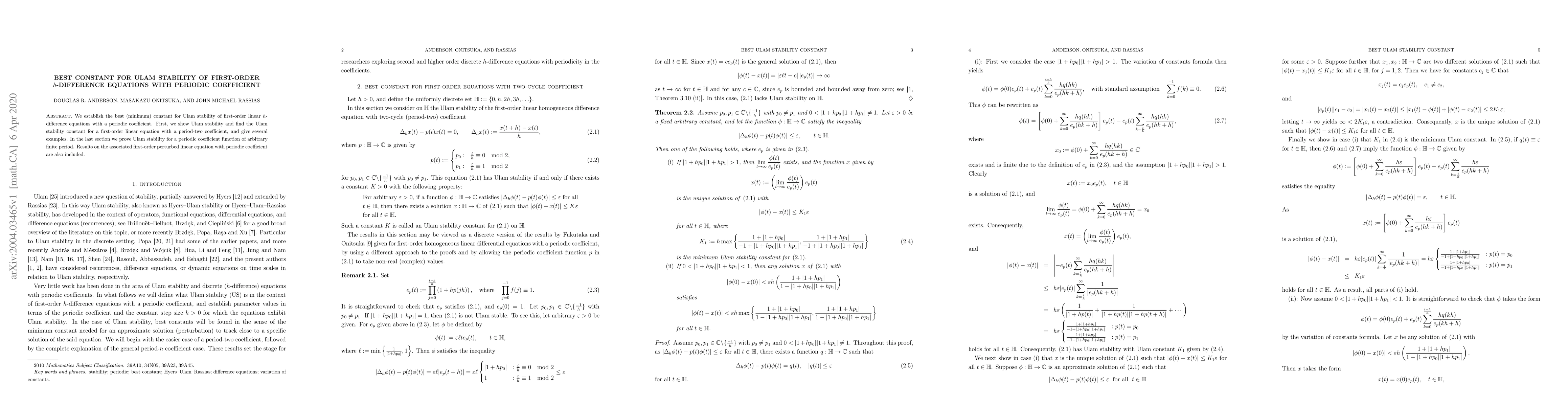 We establish the best (minimum) constant for Ulam stability of first-order linear $h$-difference equations with a periodic coefficient. First, we show Ulam stability and find the Ulam stability constant for a first-order linear equation with a period-two coefficient, and give several examples. In the last section we prove Ulam stability for a periodic coefficient function of arbitrary finite period. Results on the associated first-order perturbed linear equation with periodic coefficient are also included.