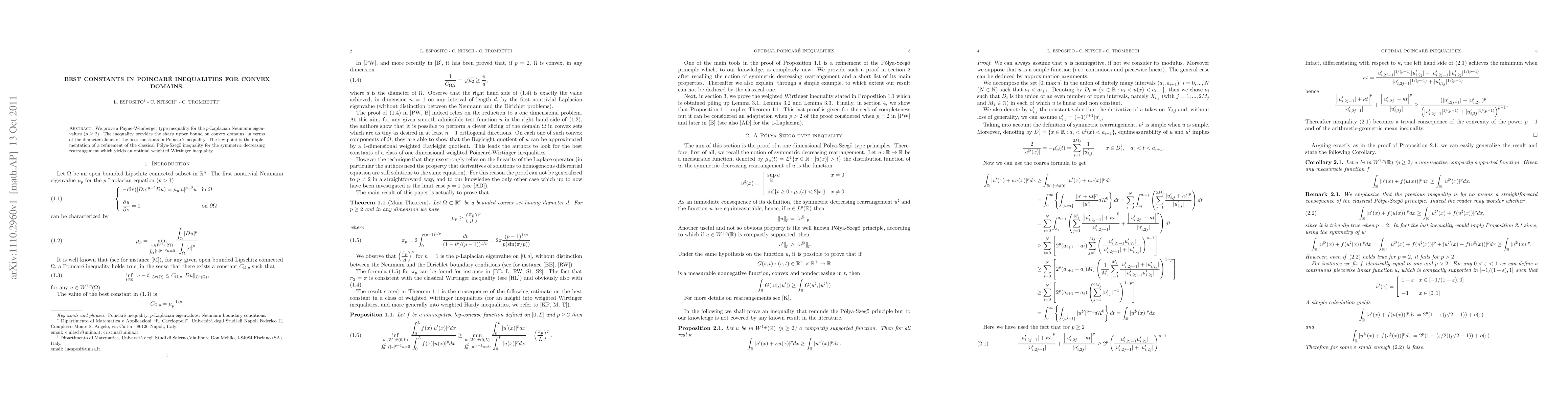 Summary: The paper establishes a sharp upper bound on the best constants in Poincaré inequalities for convex domains, using a refined Pólya-Szegő inequality and an optimal weighted Wirtinger inequality, leading to a Payne-Weinberger type inequality for $p$-Laplacian Neumann eigenvalues.