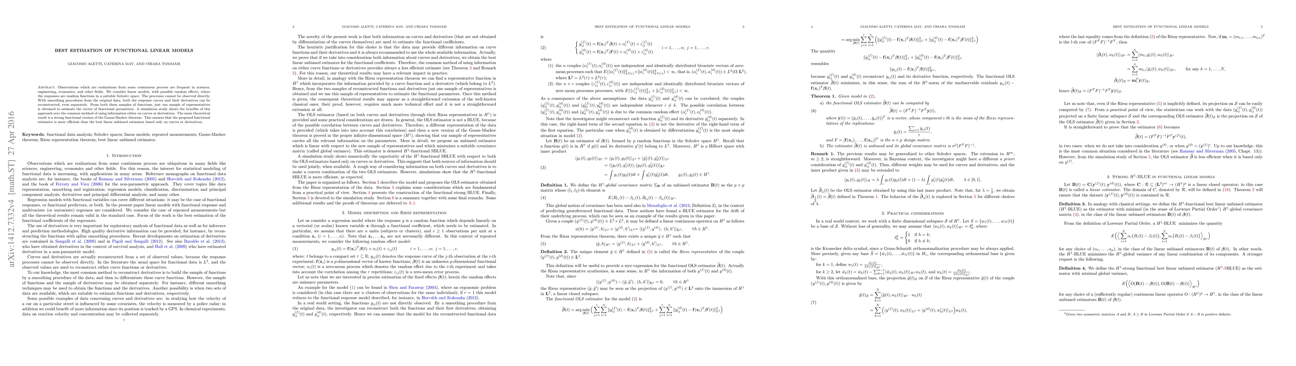 Observations which are realizations from some continuous process are frequent in sciences, engineering, economics, and other fields. We consider linear models, with possible random effects, where the responses are random functions in a suitable Sobolev space. The processes cannot be observed directly. With smoothing procedures from the original data, both the response curves and their derivatives can be reconstructed, even separately. From both these samples of functions, just one sample of representatives is obtained to estimate the vector of functional parameters. A simulation study shows the benefits of this approach over the common method of using information either on curves or derivatives. The main theoretical result is a strong functional version of the Gauss-Markov theorem. This ensures that the proposed functional estimator is more efficient than the best linear unbiased estimator based only on curves or derivatives.